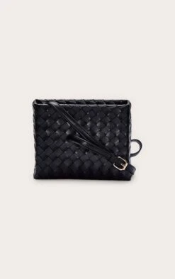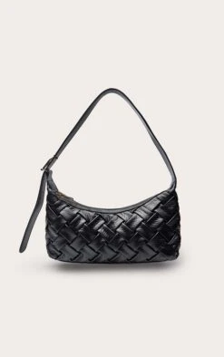 PrettyLittleThing Black Hand Woven Faux Leather Shoulder Bag – Structured Evening Purse