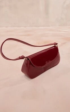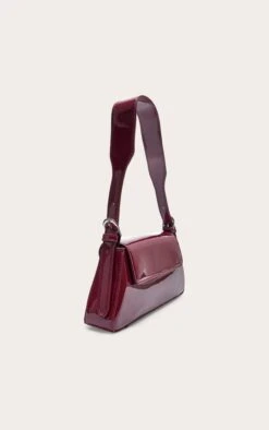 PrettyLittleThing Burgundy Patent Trapeze Shoulder Bag – High-Shine Modern Evening Handbag