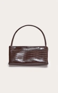 PrettyLittleThing Brown Croc Embossed Slim Shoulder Bag – Structured Curved Baguette Style