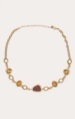 PrettyLittleThing Plum & Topaz Studded Necklace – Jewel-Toned Delicate Gold-Tone Statement Piece