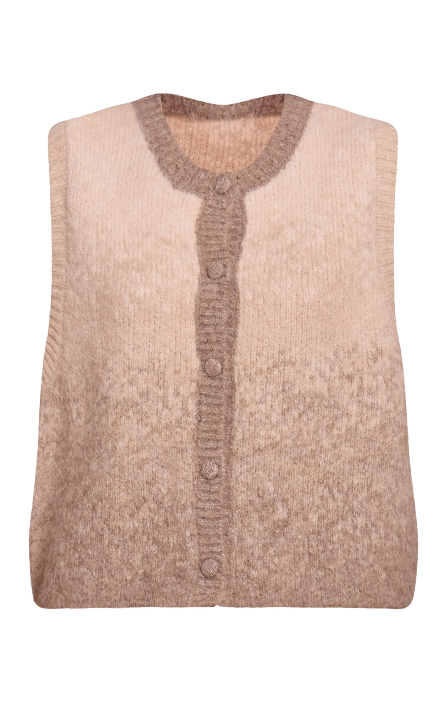 Elevate your everyday essentials with the beige ombre brushed knitted vest. Designed in a soft brushed ombre knit, this vest offers a fitted cut with wide straps for effortless layering. Pair with high-waisted jeans or the matching shorts and a pair of flat loafers for a chic coordinated finish.