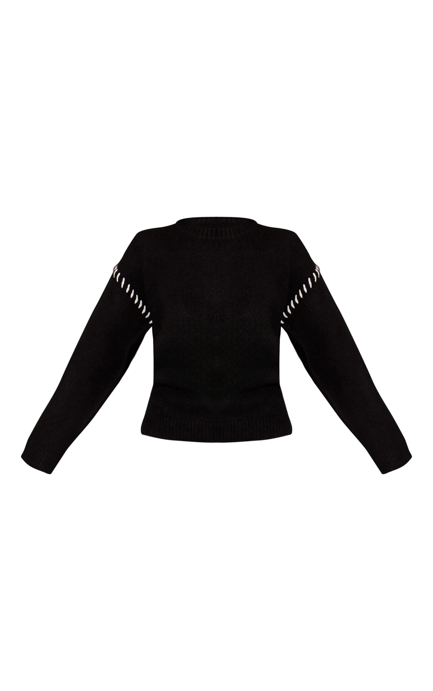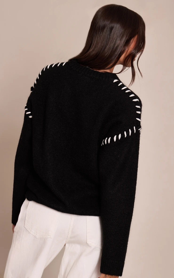 Master comfortable elegance with an artful twist. The black blanket stitch knit sweater delivers an elevated take on classic knitwear, featuring a refined crew neckline, a relaxed silhouette, and striking white blanket stitch detailing that artfully traces the shoulders and upper arms. Pair this essential black sweater with tailored wide-leg pants for a sharp daytime ensemble, or try it with high-waisted denim for an effortless weekend aesthetic. To complete your look, step into elegant brown heels for a refined finish, adding delicate drop earrings to elevate the neckline with a subtle gleam.