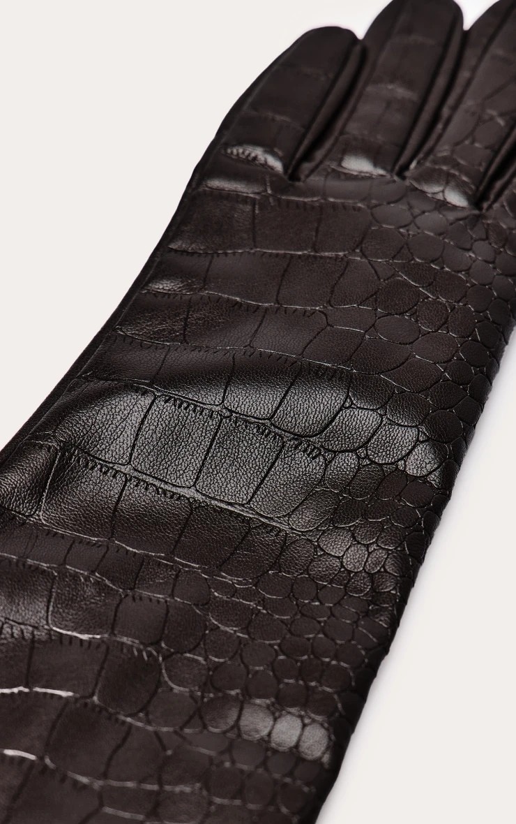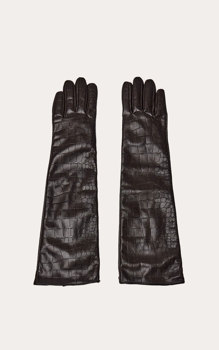 Elevate your evening aesthetic with an infusion of high-fashion drama and refined texture. The Chocolate Croc Faux Leather Long Gloves are designed to make a powerful statement, blending vintage glamour with modern edge.
