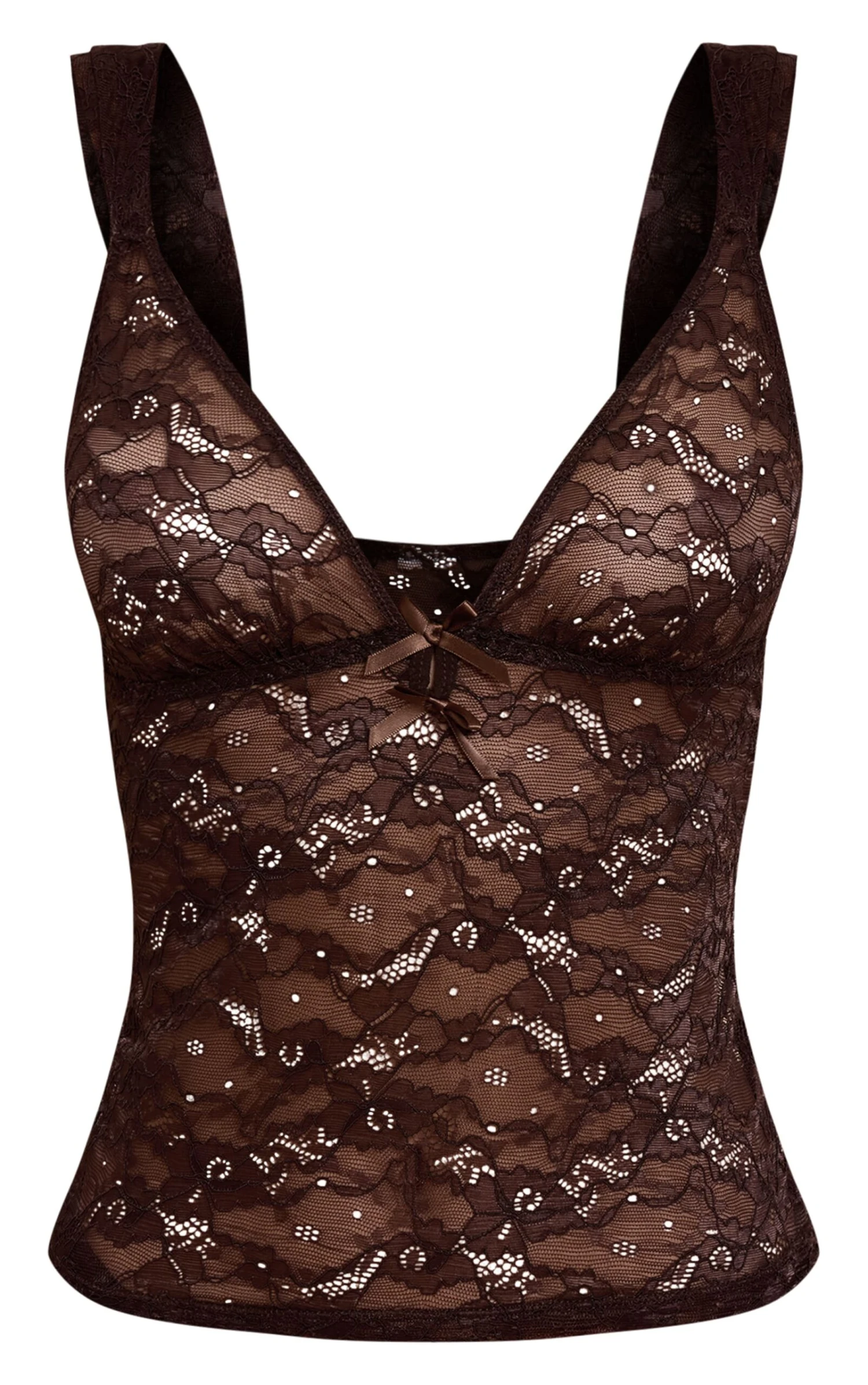 Feel confident in this chocolate lace cami and thong lingerie set. Brought to you in chocolate hue lace, this set has a matching cami top and thong. Wear it under your outfit for additional support or with a satin robe for a cosy night in.
