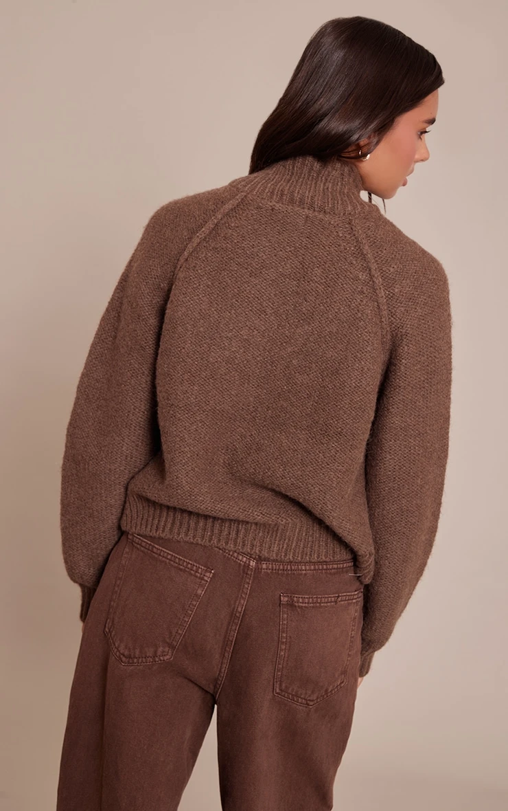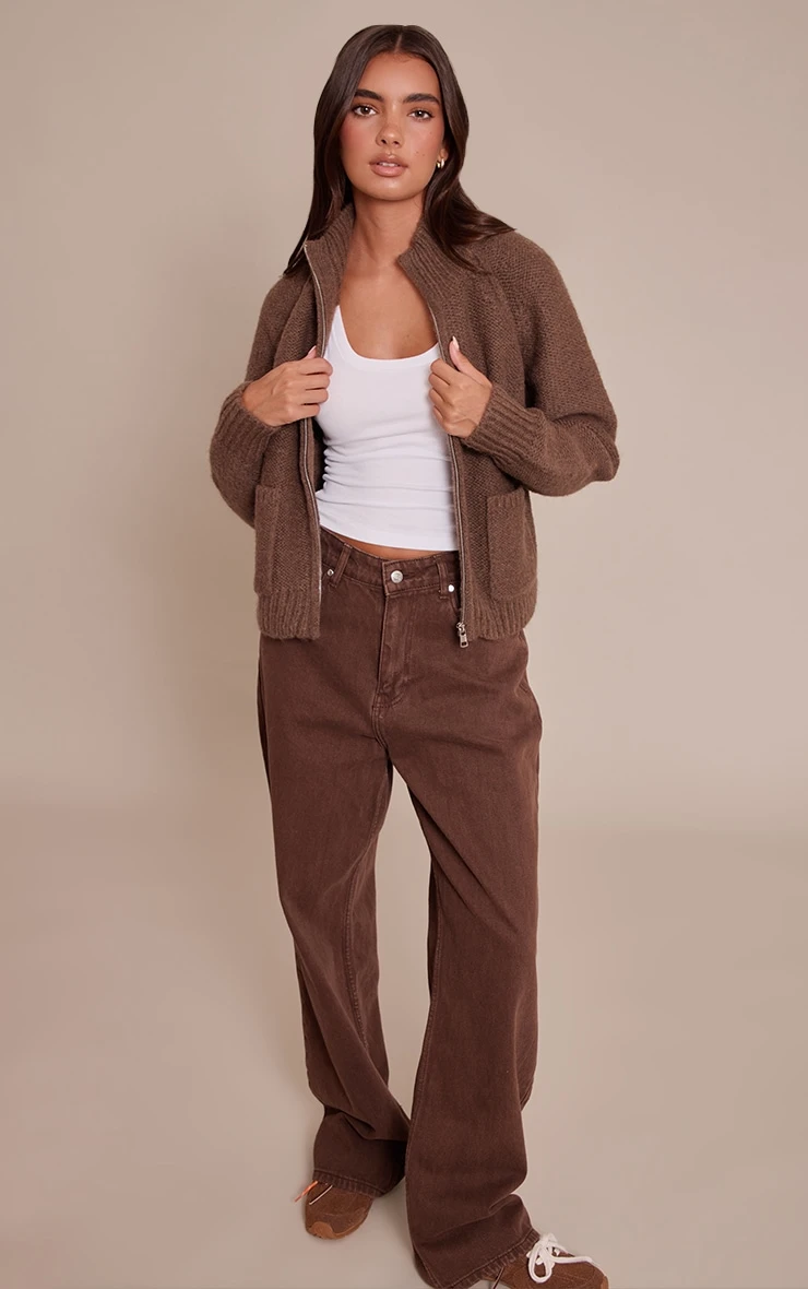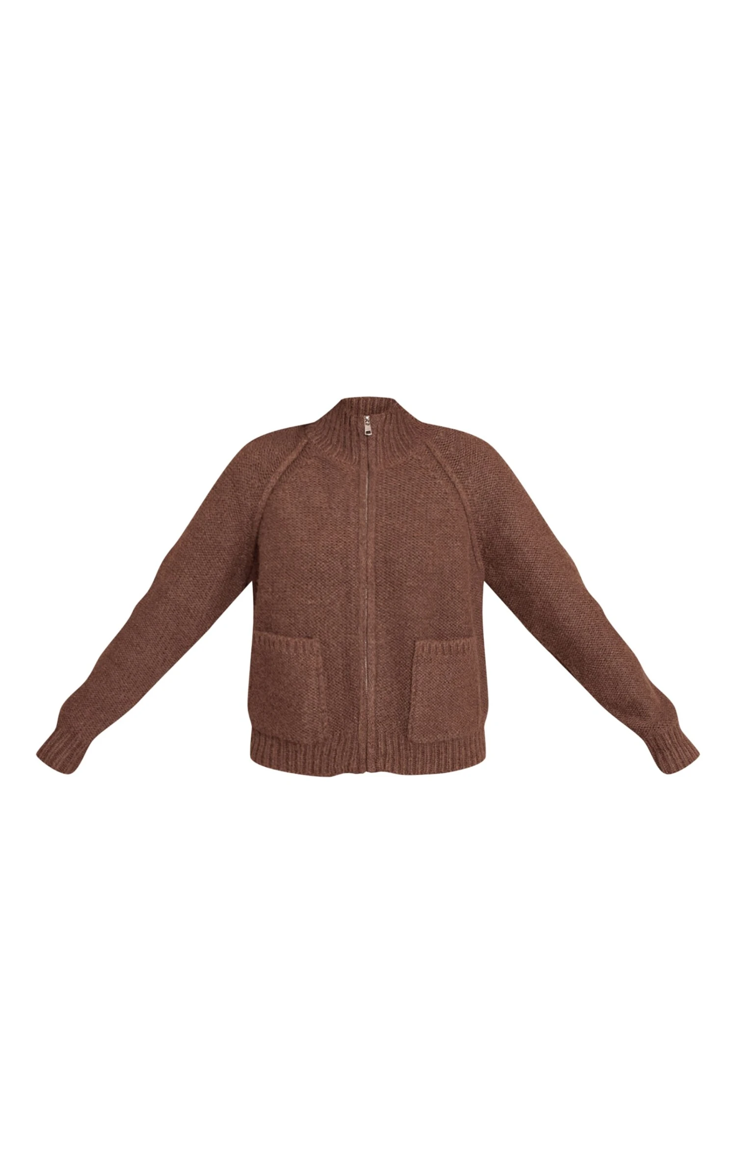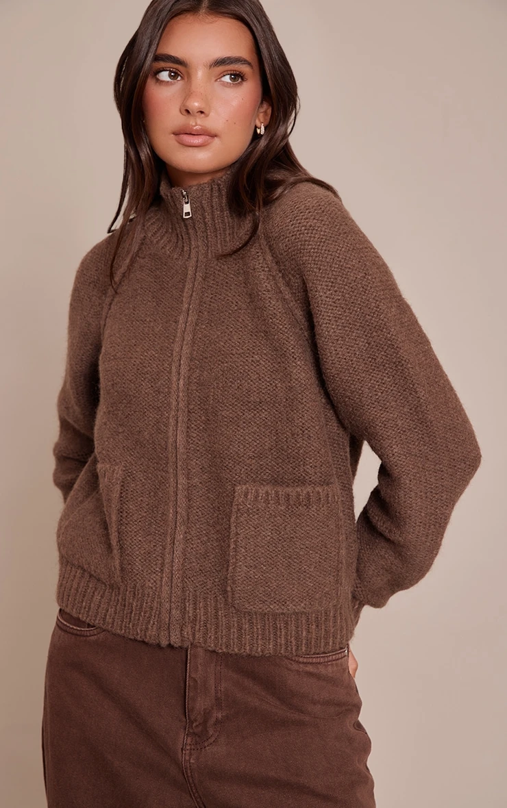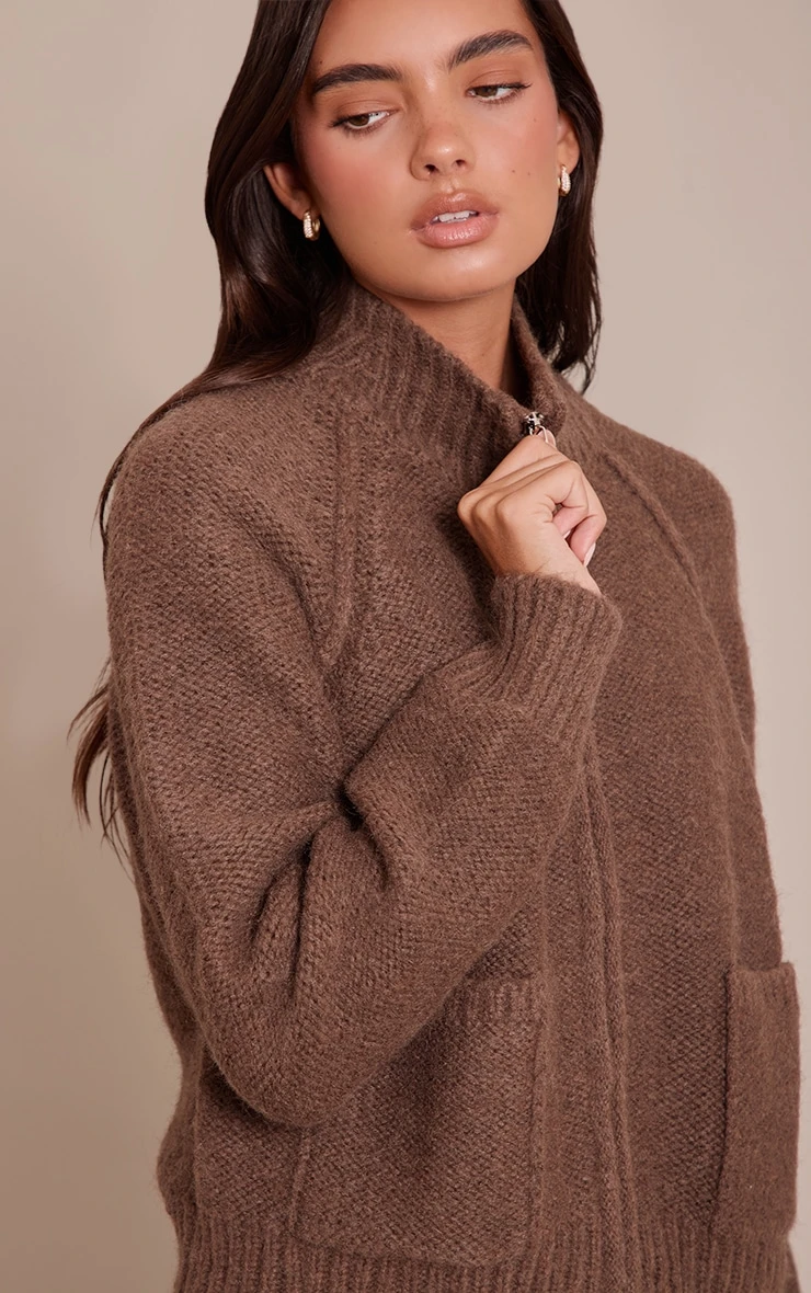 Presented in a rich, deep chocolate brown hue, this cardigan features a clean high-neck silhouette and a sleek full-length zip fastening for versatile styling. The relaxed aesthetic is defined by practical front patch pockets and finished with neat ribbed detailing at the cuffs and hem. Whether styled with tailored trousers for a polished office look or paired with high-waisted denim and cowboy boots for a casual weekend, this knit ensures a confident, effortless aesthetic.