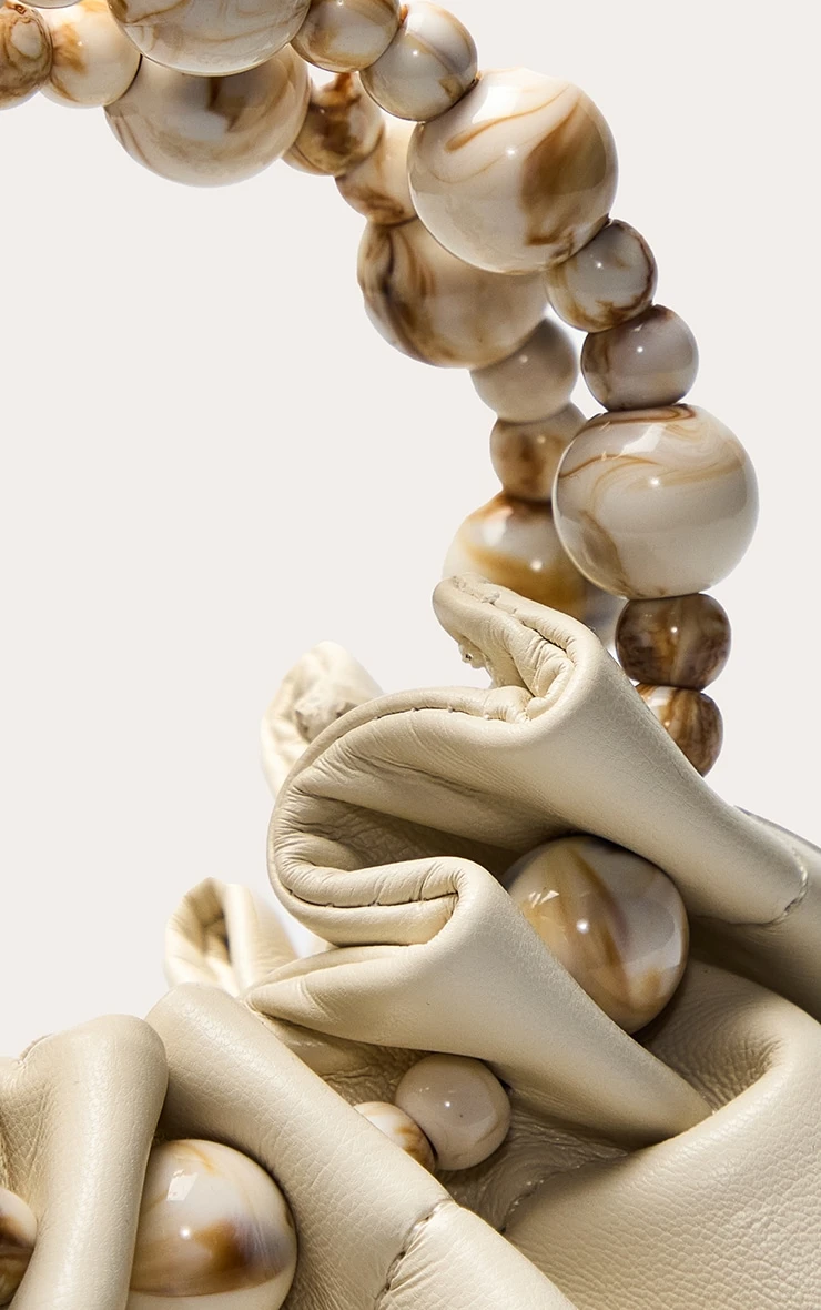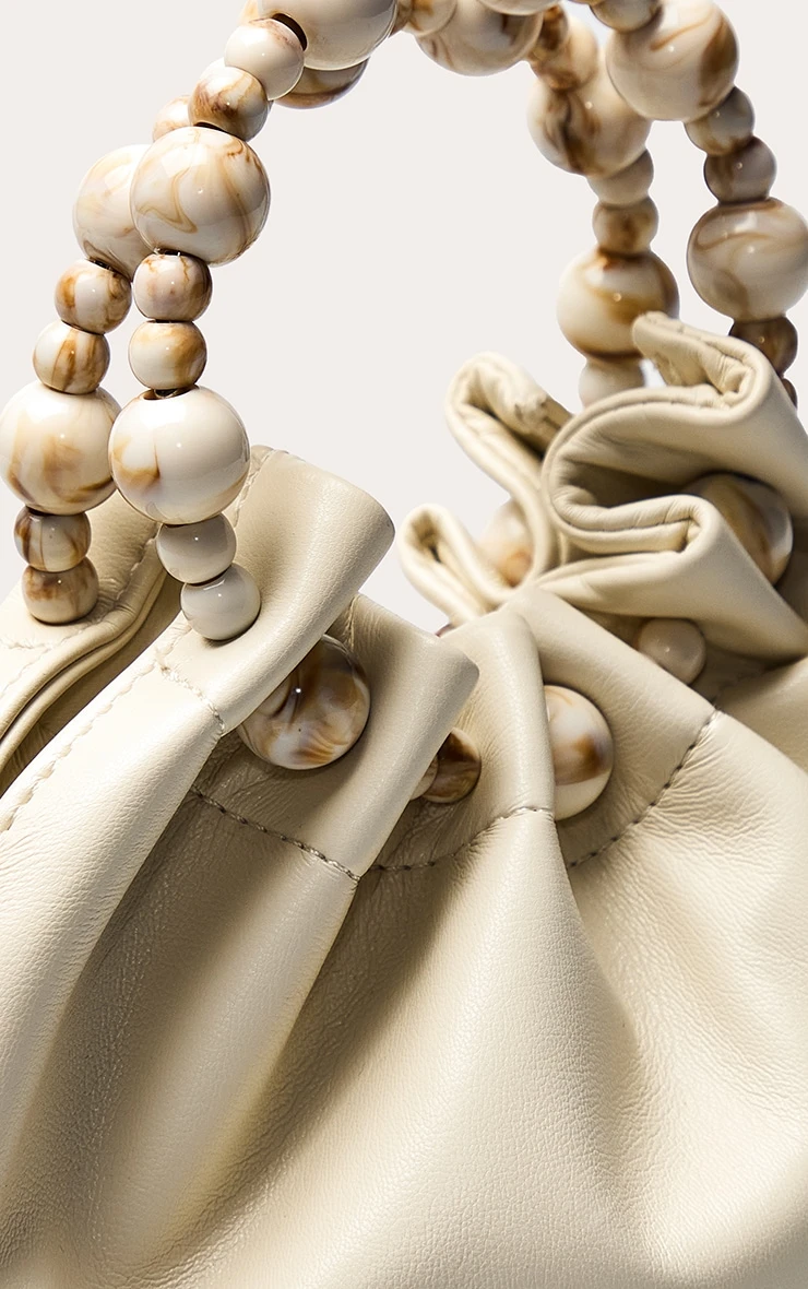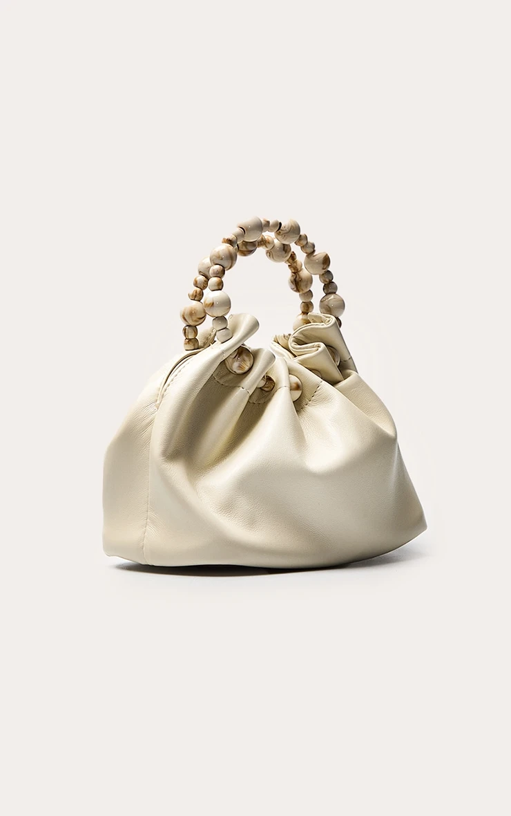 The cream beaded handle grab bag offers delicate femininity with a modern twist. Featuring a smooth body in soft cream and a statement beaded handle, it balances minimalism with subtle detailing. Style with pastel tailoring for wedding guest looks, or pair with satin slip dresses for summer evening events.