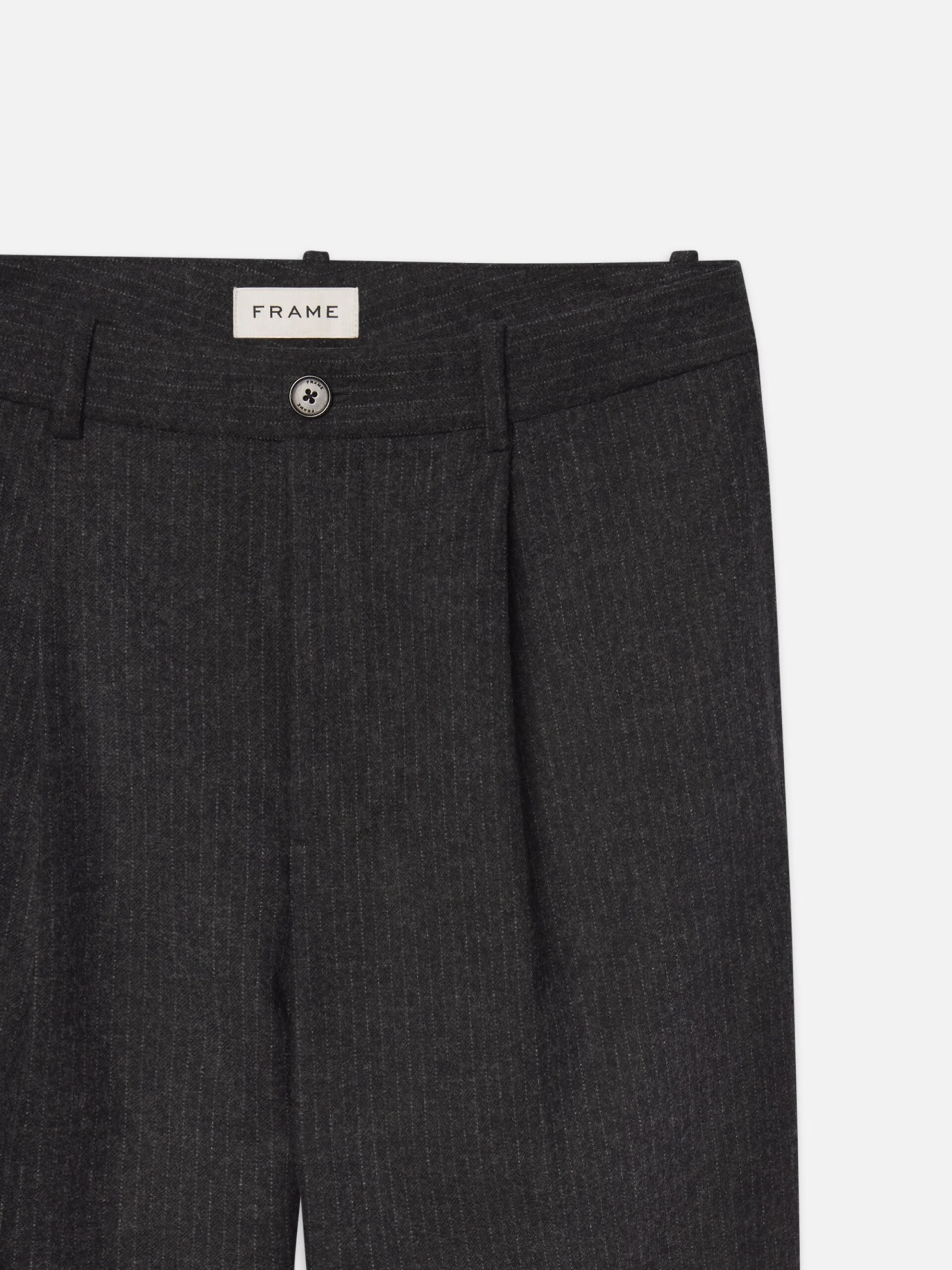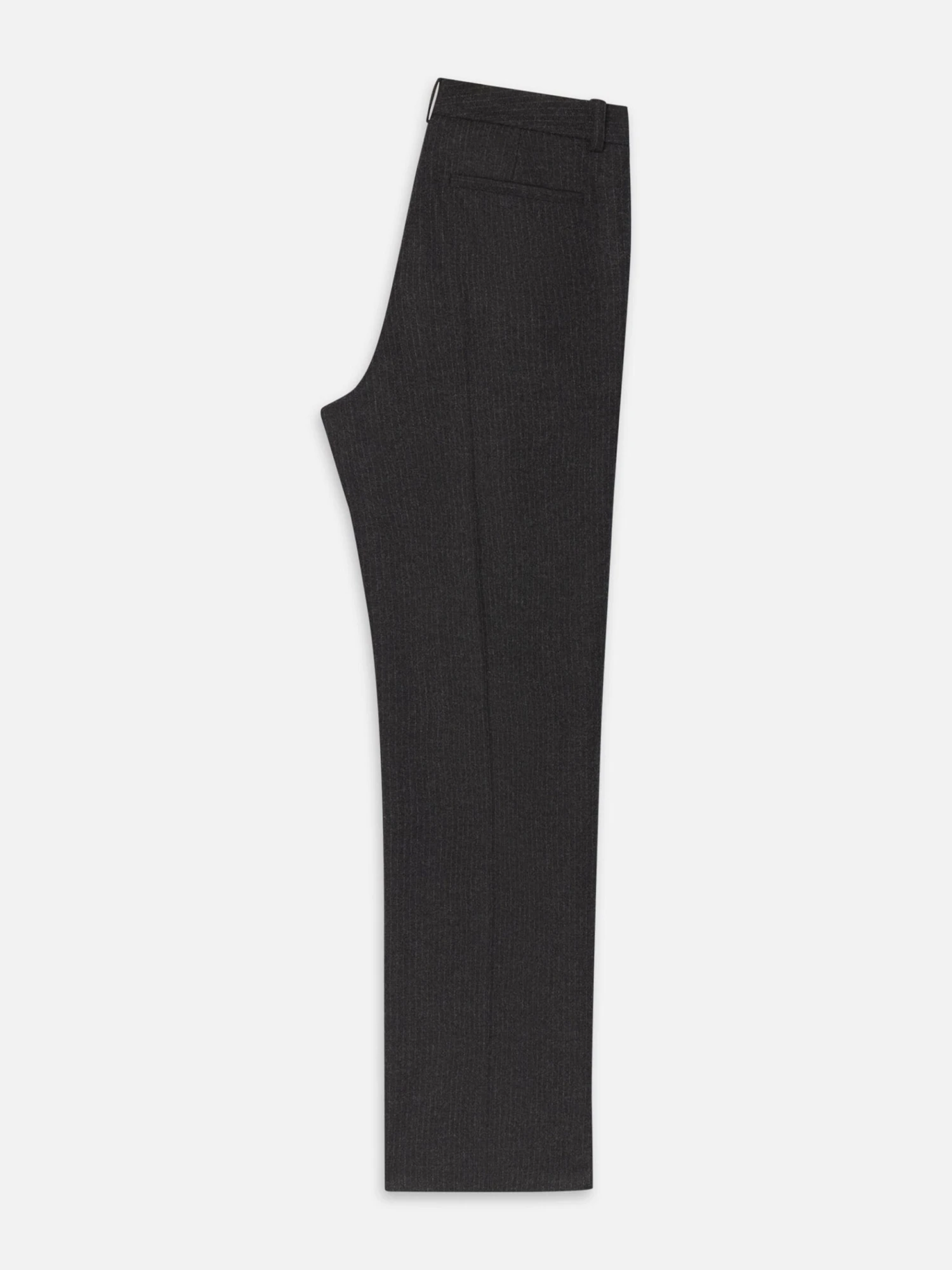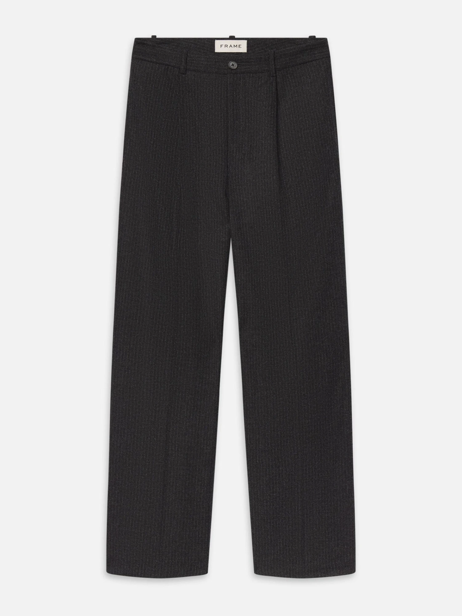 The deep grey fabric is accented by sharp, subtle pinstripes, creating an elongated and streamlined appearance. The wide-leg cut ensures a modern drape, making these a standout piece in any suiting collection.