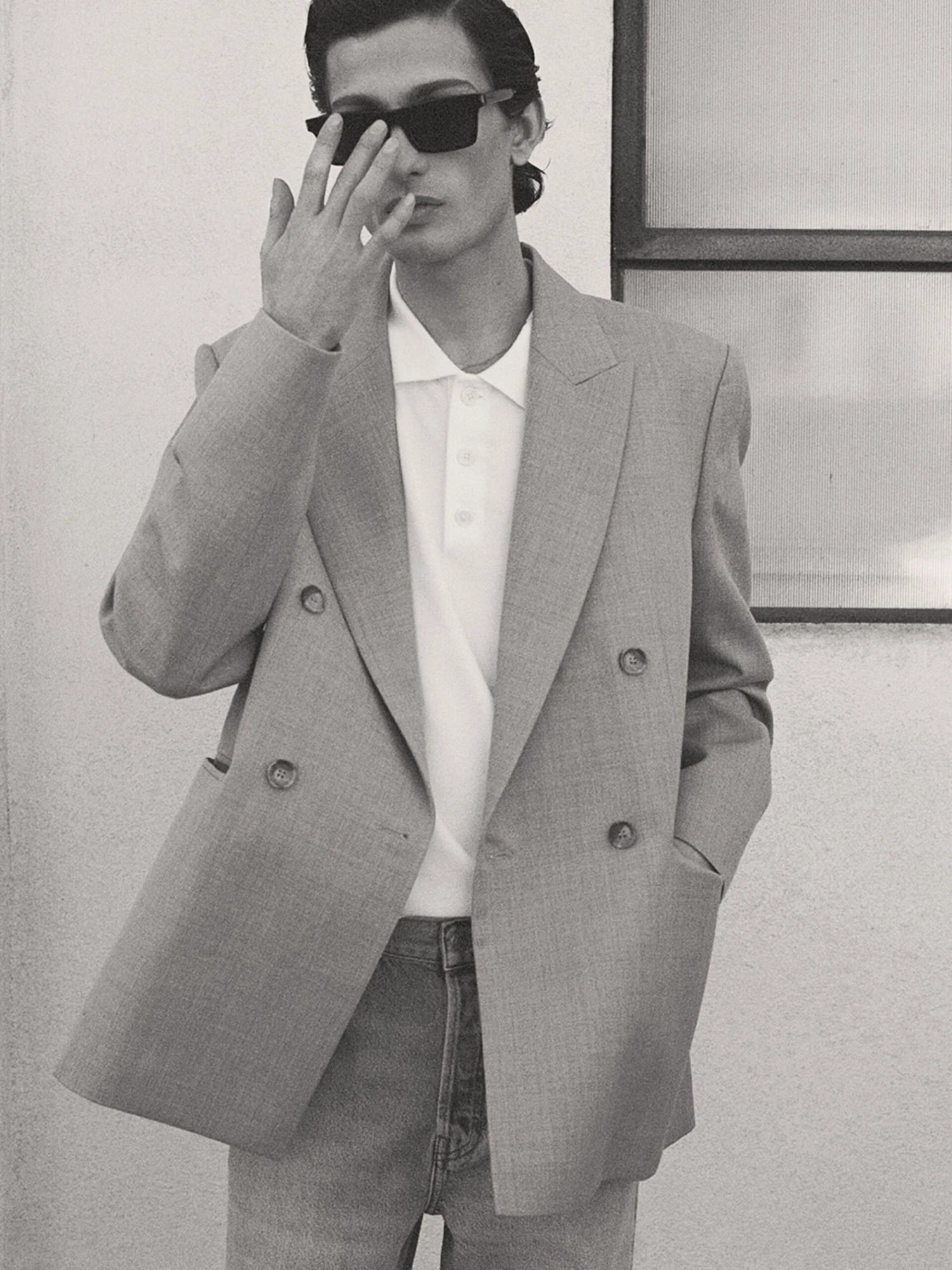 This blazer features a classic double-breasted silhouette with sharp, structured shoulders that command attention. The clean welt pockets and refined lapels enhance its streamlined aesthetic, making it a versatile cornerstone for any summer set.