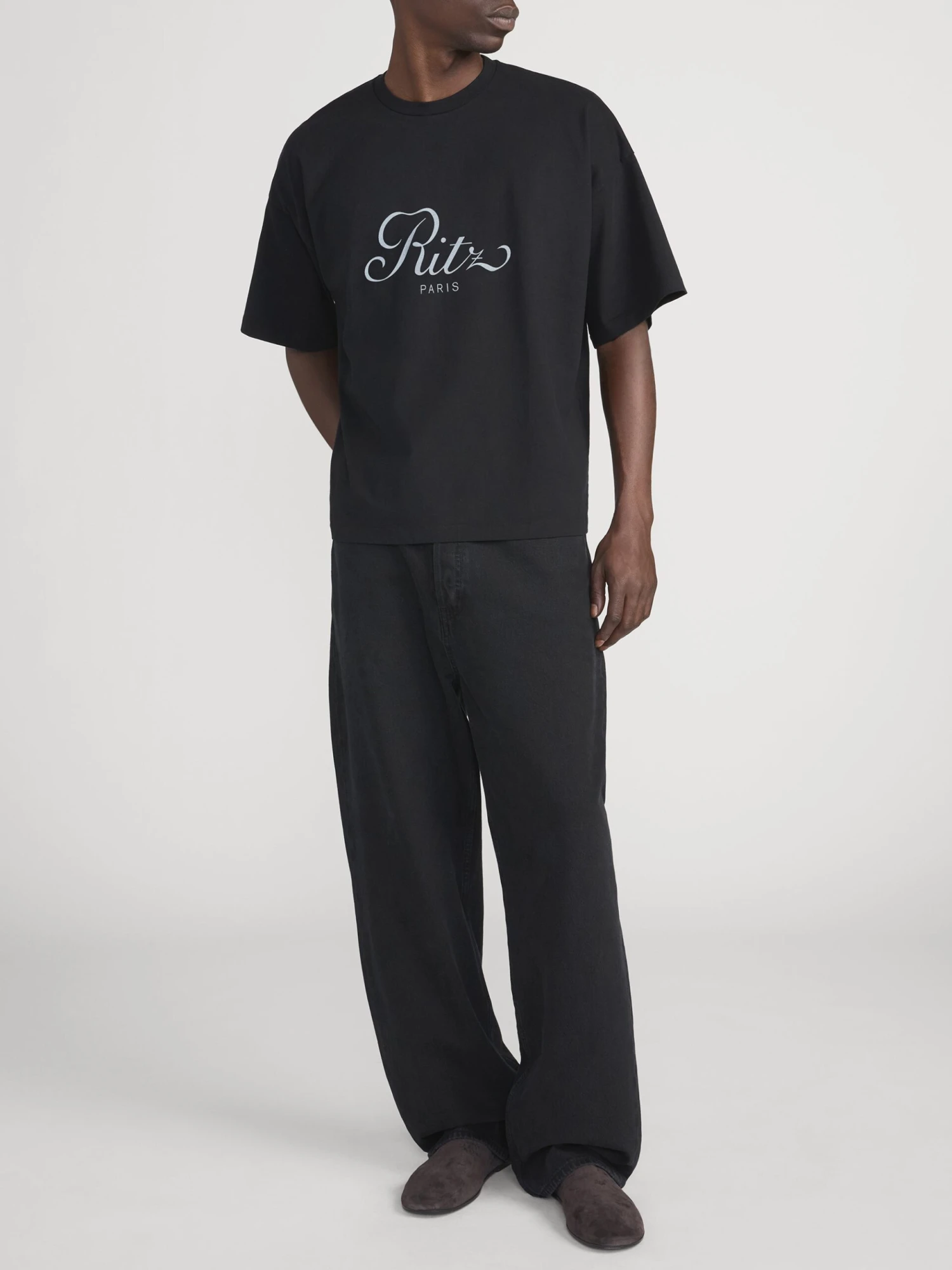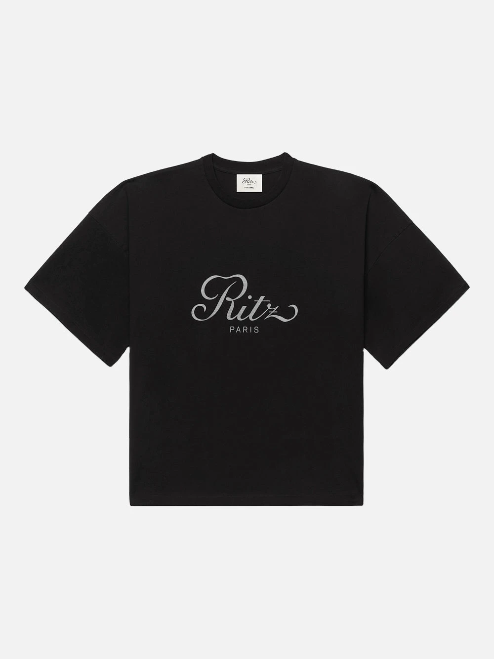 The shirt features a deep, classic black hue that serves as the perfect canvas for the prestigious Ritz Paris logo prominently displayed at the front. Cut in a contemporary relaxed, cropped silhouette, it offers a refined drape that pairs effortlessly with high-waisted denim or athletic shorts.