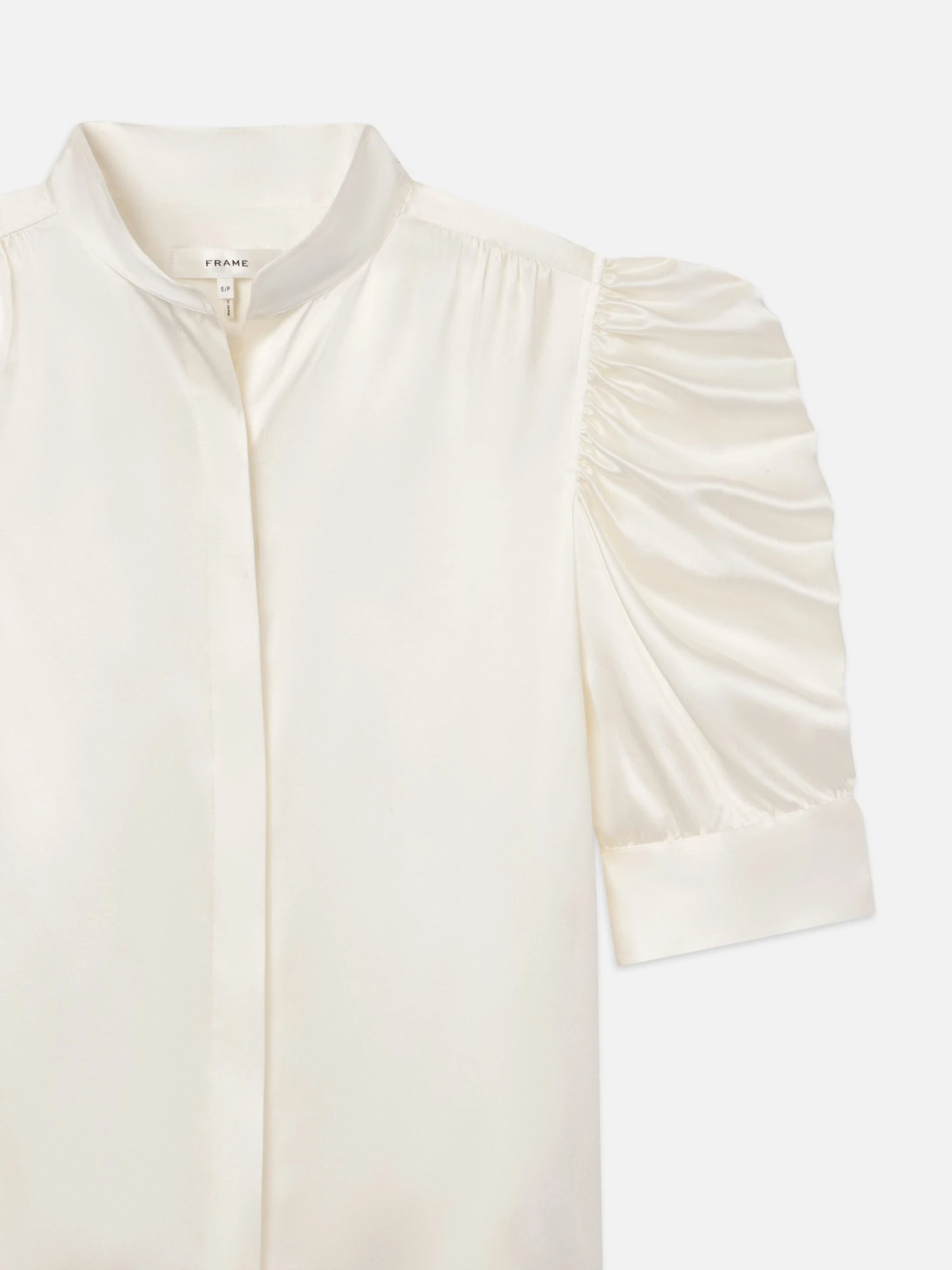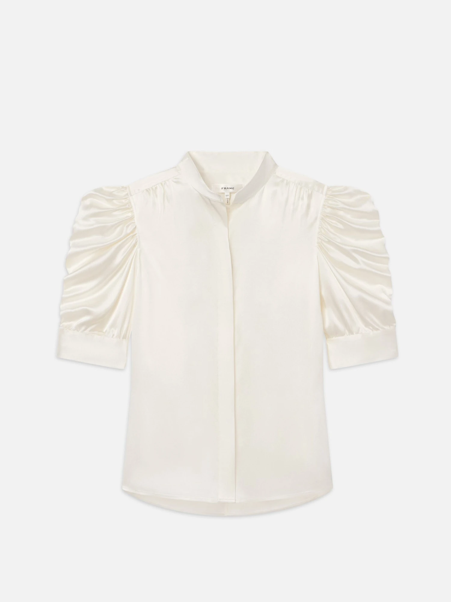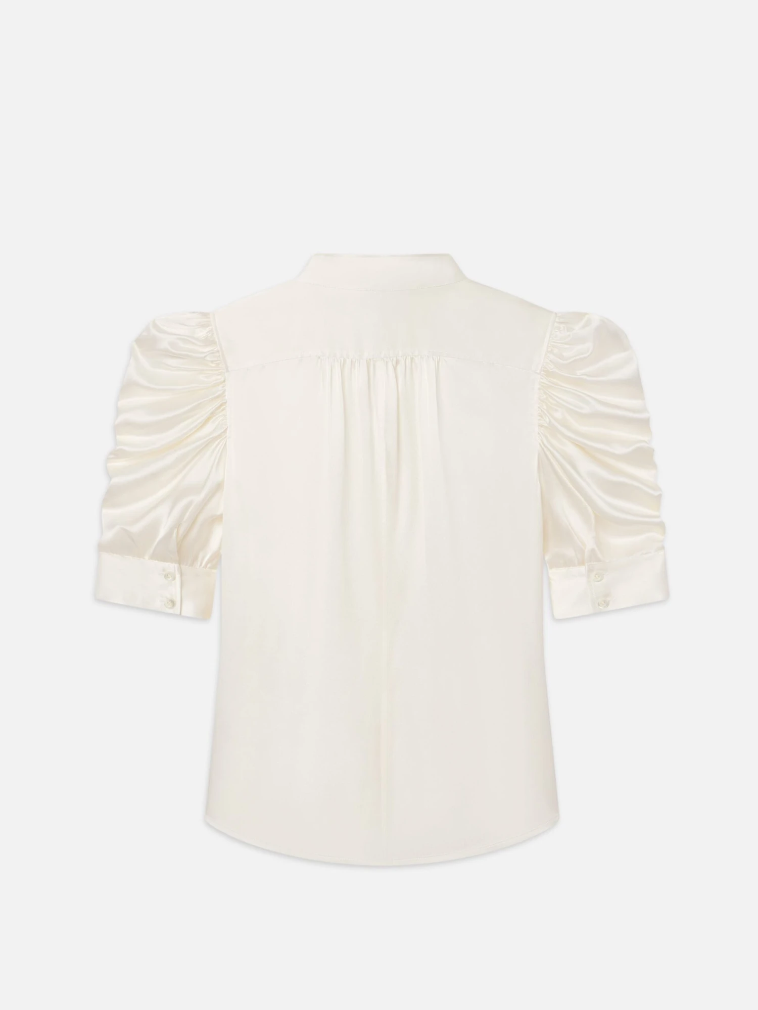 This delicate silk blouse epitomizes modern femininity, featuring a high neckline and boldly puffed sleeves with ruched detailing. We love it tucked into cropped wide jeans with leather slides and a slim belt.