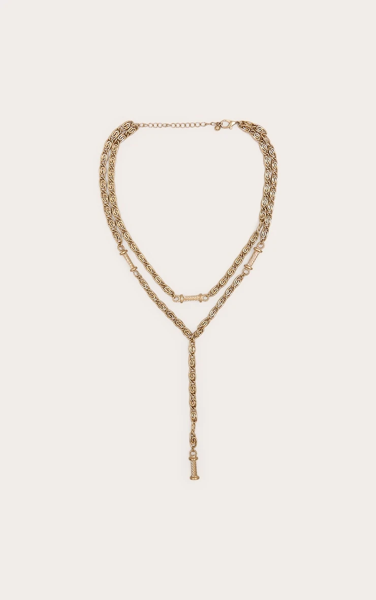 This necklace showcases a series of heavy, interlocking gold-tone links in varying lengths, culminating in a striking lariat drop. The high-shine finish provides a luxurious aesthetic, while the layered construction offers a curated, complex look that adds depth to your silhouette.