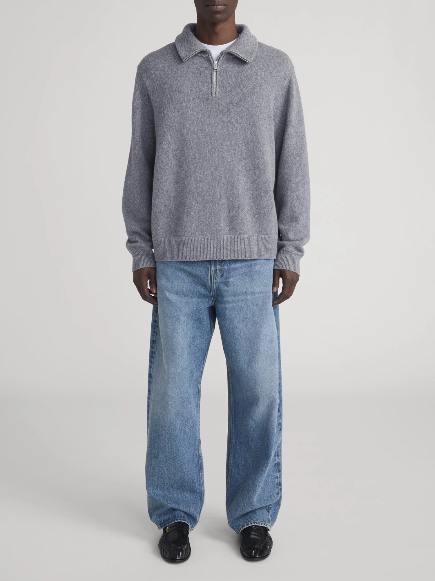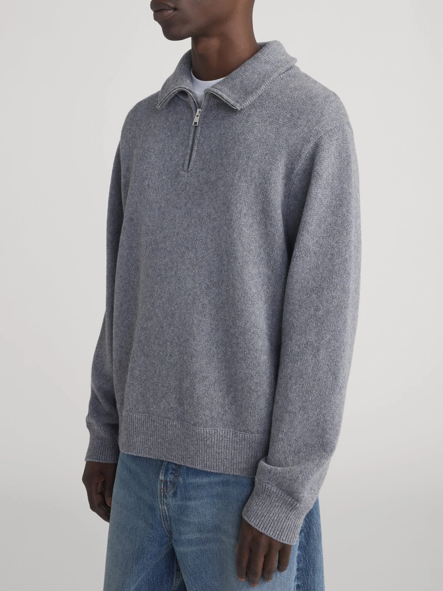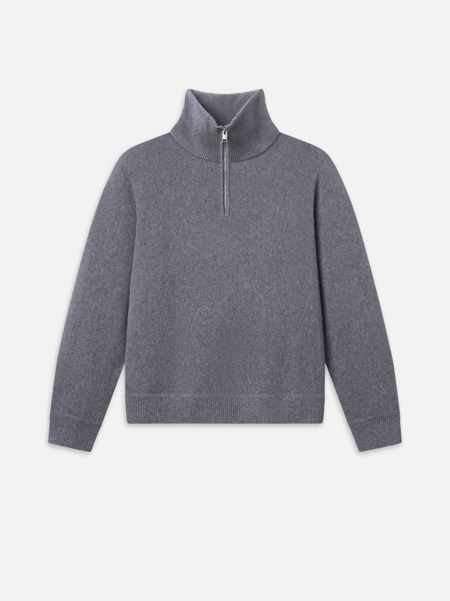 The sweater features a multi-tonal grey melange knit that adds depth and texture to your outfit. The smooth knit body is complemented by a sleek silver-tone half-zip closure, allowing for easy layering over shirts or under heavier outerwear.