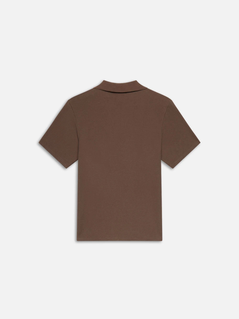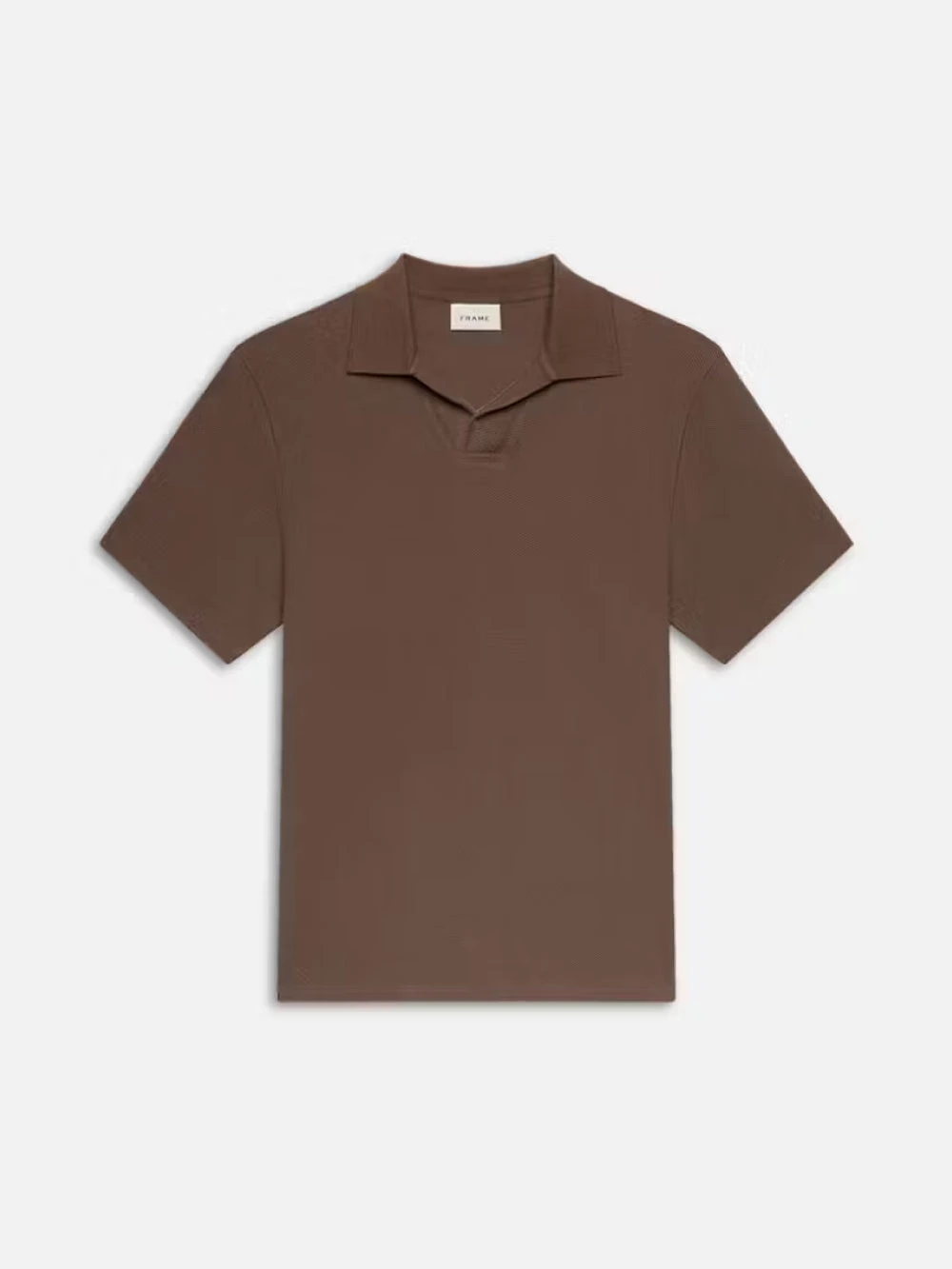 A modern update to the classic closet staple, this short-sleeve polo features an open V-neck collar sans summarys. The premium textured cotton fabrication lends a luxurious look and feel. Fit it into your 9-5 rotation as well as your off-duty weekend routine.