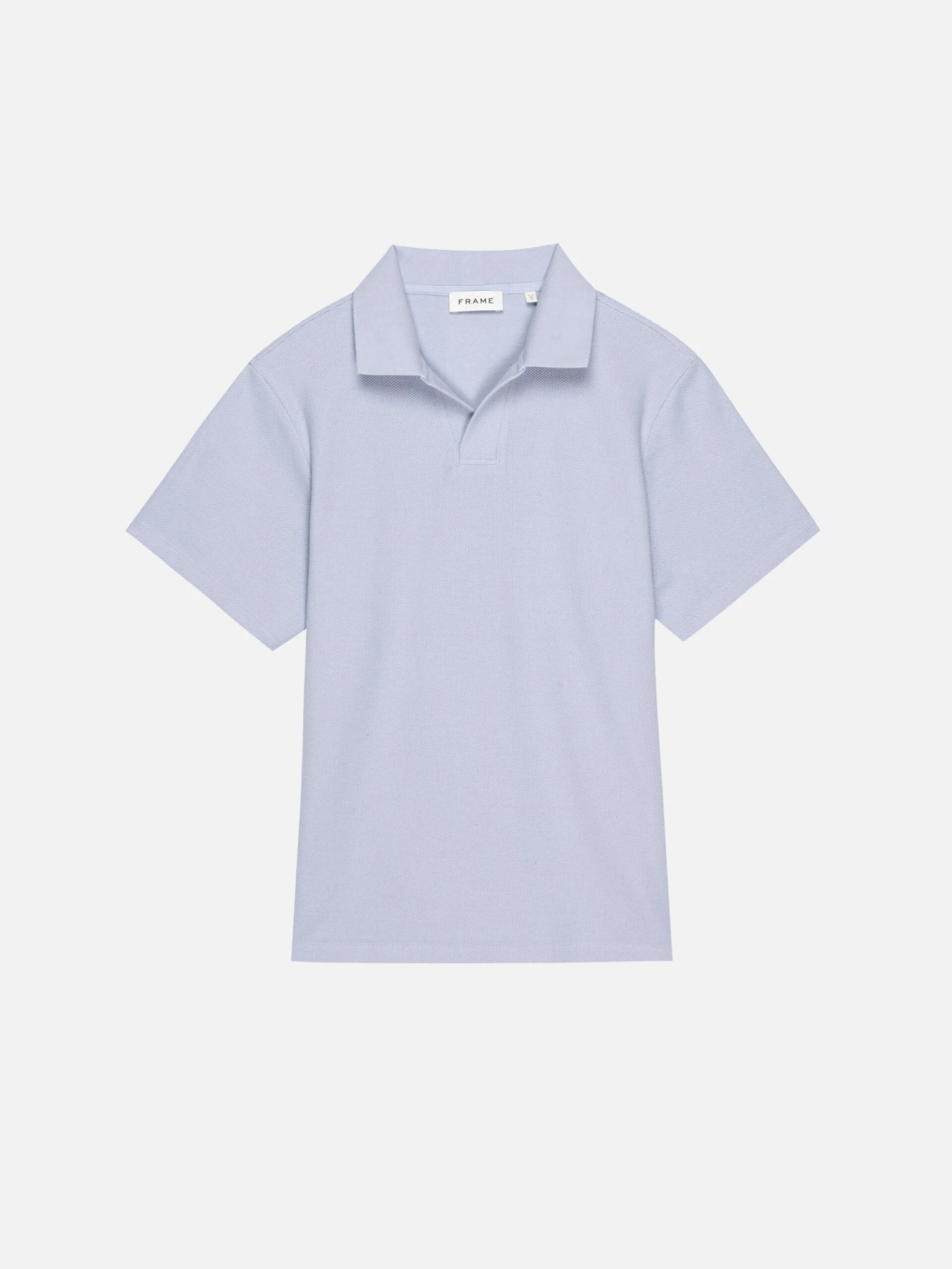 Featured in a serene Baby Blue, this shirt is defined by its intricate jacquard knit pattern which provides a rich, tactile dimension. The clean, buttonless open V-neck collar and matching ribbed cuffs offer a sleek, contemporary profile that separates it from standard polos.