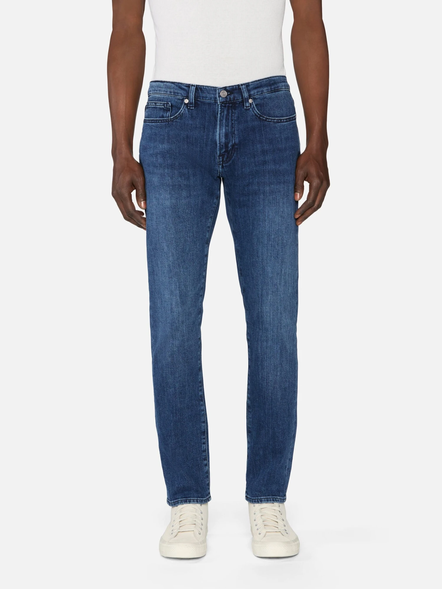 A FRAME signature jean, this style is designed with a classic 5-pocket construction, comfortable mid rise, flattering straight leg, and tapered slim fit at the leg opening. Crafted from smooth Structured Stretch denim in an inky blue wash.