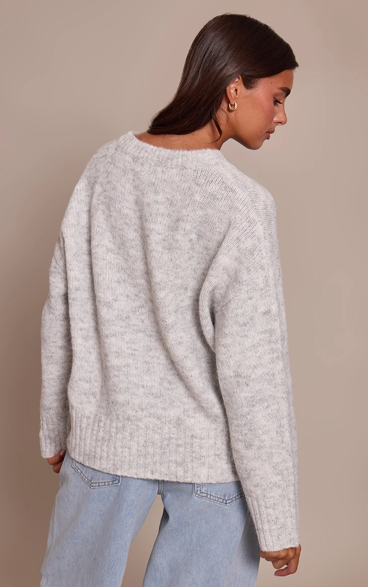 This sweater features a flattering V-neckline and a relaxed silhouette, making it the ultimate versatile layering piece. The soft light grey shade provides a neutral base for any outfit, while the intricate ribbed detailing across the fabric offers a premium, structured feel. Whether you are pairing it with sleek slip-on mule heels or casual sneakers, this sweater ensures a chic finish for any daytime occasion.