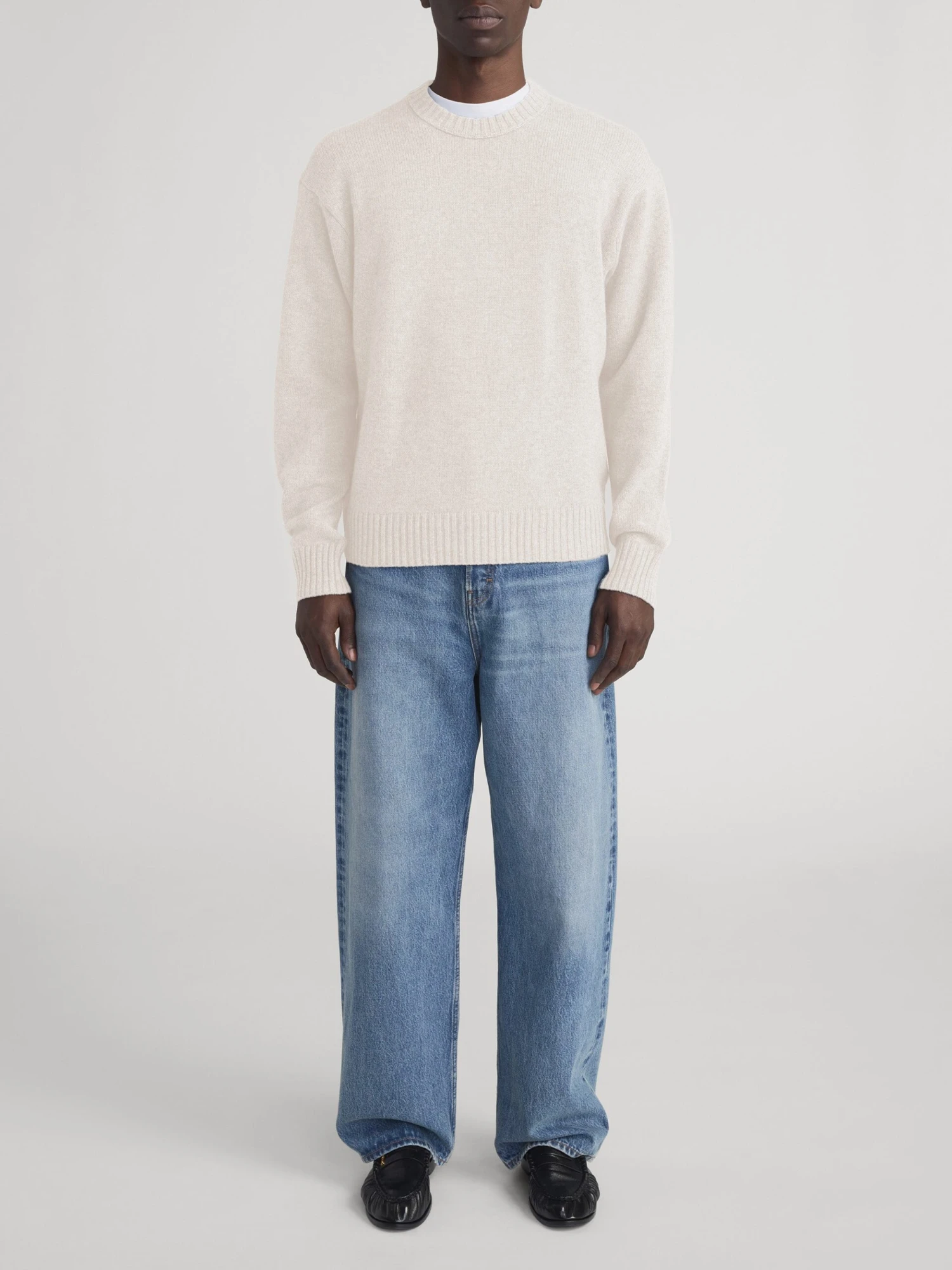 This Cream Cashmere Crewneck Sweater offers a timeless neutral aesthetic, meticulously crafted to be the cornerstone of your refined casual look. The soft cream hue provides a versatile base, while the intricate ribbed detailing at the collar, cuffs, and hem adds a touch of classic texture and structure.
