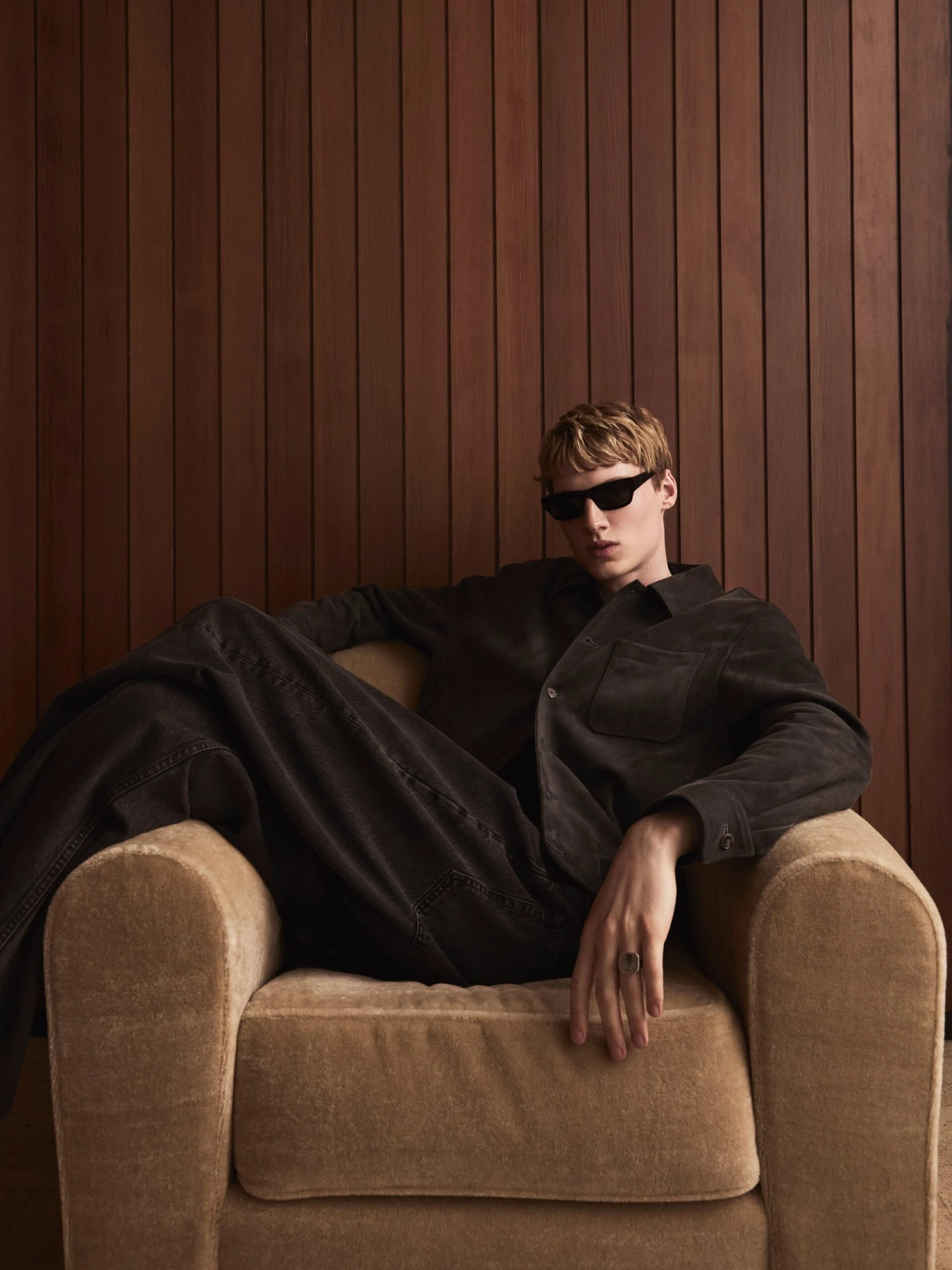 This jacket features a deep, faded black hue across its rich suede body. The design is accented with a functional chest pocket and tonal rib-knit trim at the collar, cuffs, and hem for a streamlined silhouette.