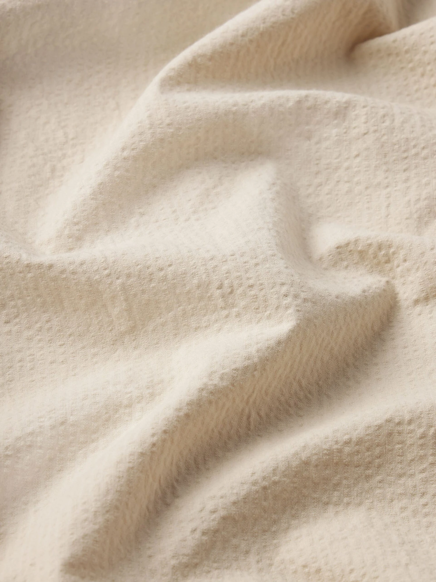 This shirt showcases a classic natural off-white hue with the characteristic puckered seersucker weave providing a subtle vertical striped texture. It is designed with a structured yet lightweight feel that maintains its shape throughout repeat wear.
