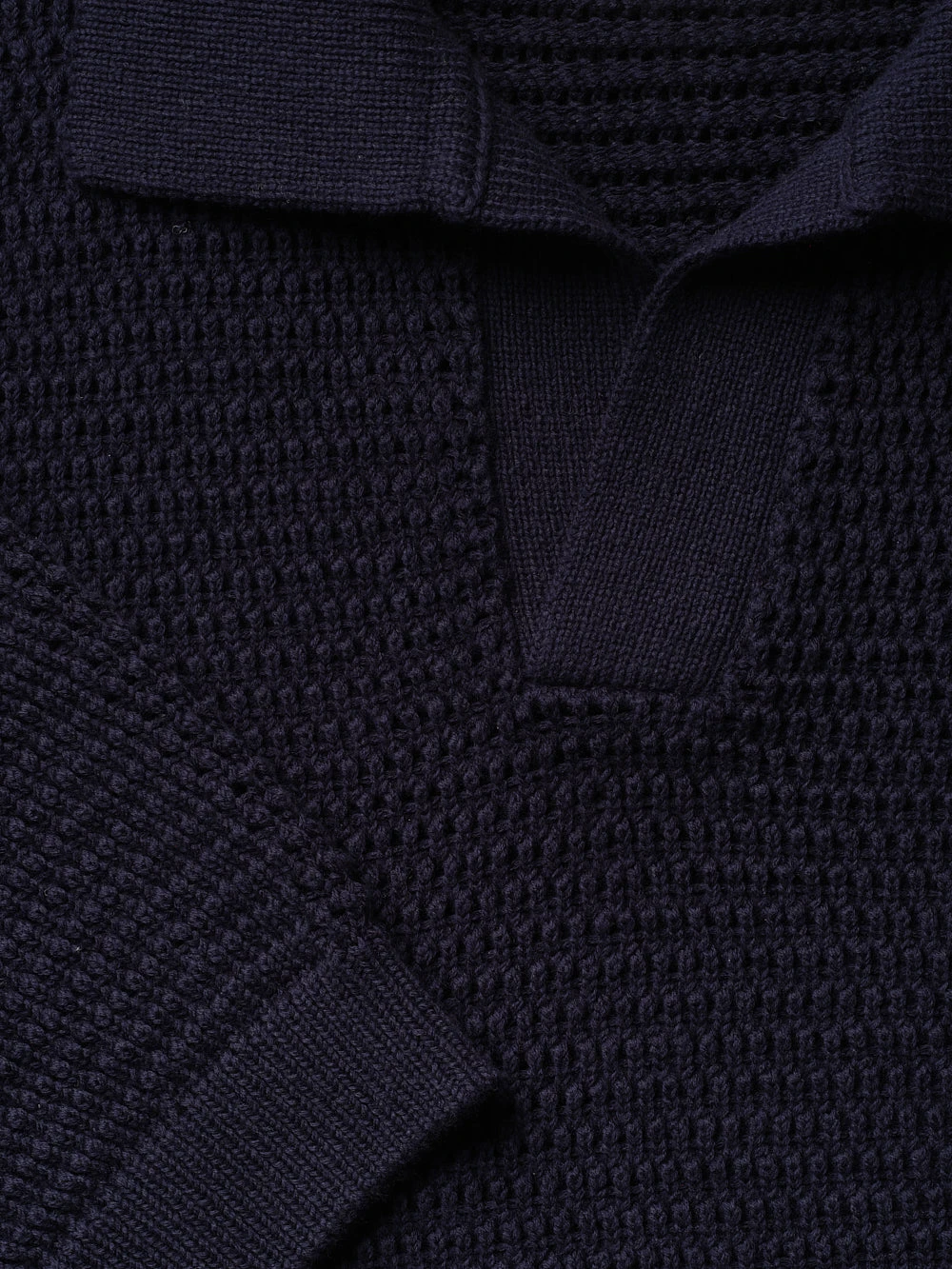 Crafted from a premium silk-cotton blend, this polo features a rich, solid navy hue with the subtle, luxurious sheen characteristic of high-quality natural yarns. The design is defined by its minimalist open v-neck collar—free of traditional buttons—creating a streamlined look that frames the neckline perfectly for both professional and casual settings.