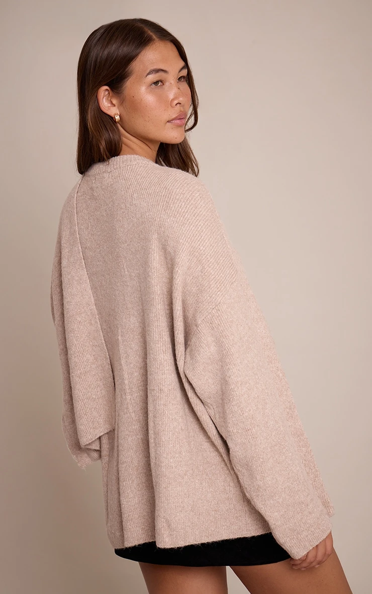 This unique piece features a sophisticated integrated scarf detail, providing a seamless draped look that eliminates the need for extra accessories. The soft oatmeal marl knit offers a versatile neutral tone, while the relaxed silhouette and long sleeves provide a modern, comfortable drape. Pair it with tailored trousers and kitten heels for a polished day-to-night ensemble.