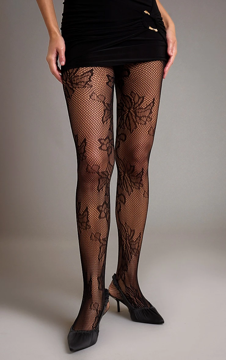 Stay sleek with the black fishnet floral lace tights. Made from a black lace fabric, they feature a fishnet design with floral detailing for a feminine edge. Perfect for layering under dresses or skirts, these tights elevate your look with texture and charm. Style with slip on mule heels and a clutch bag for effortless polish.