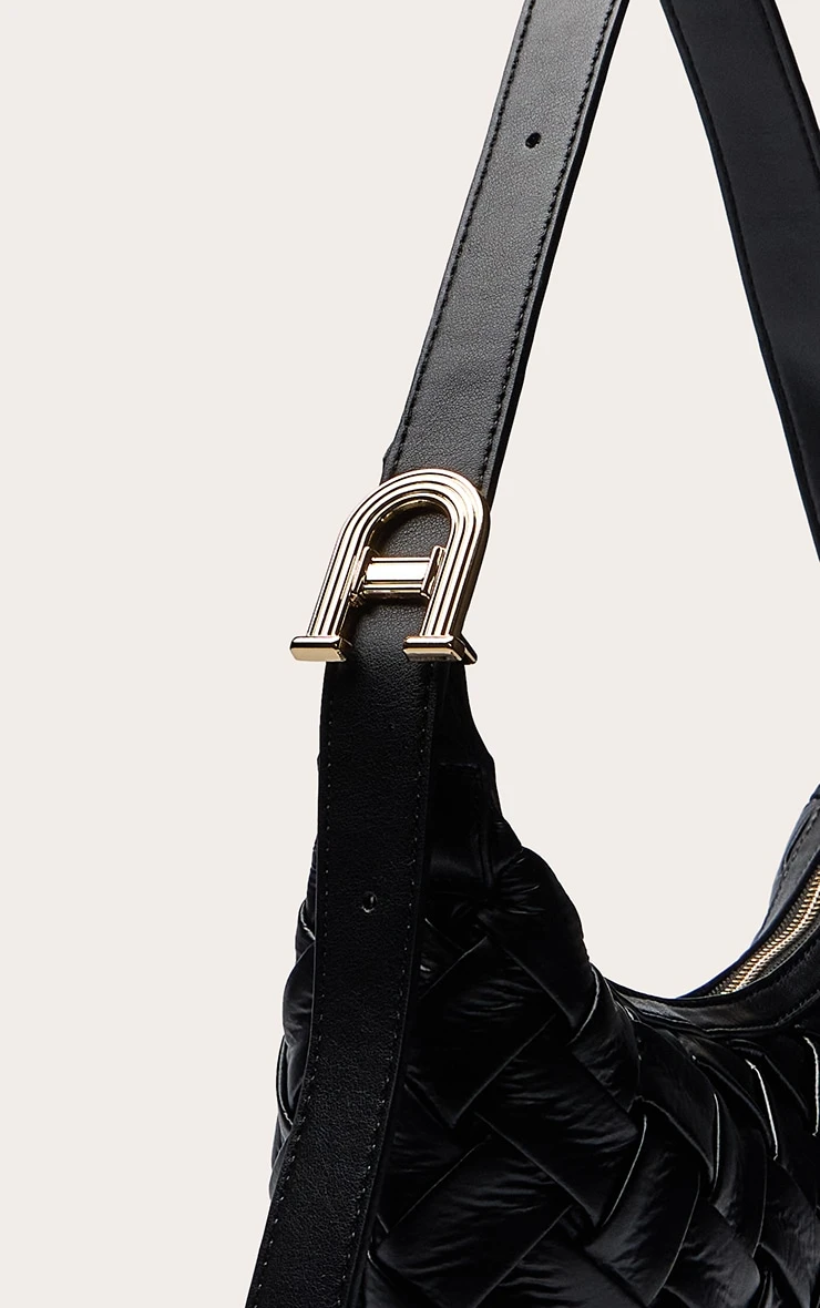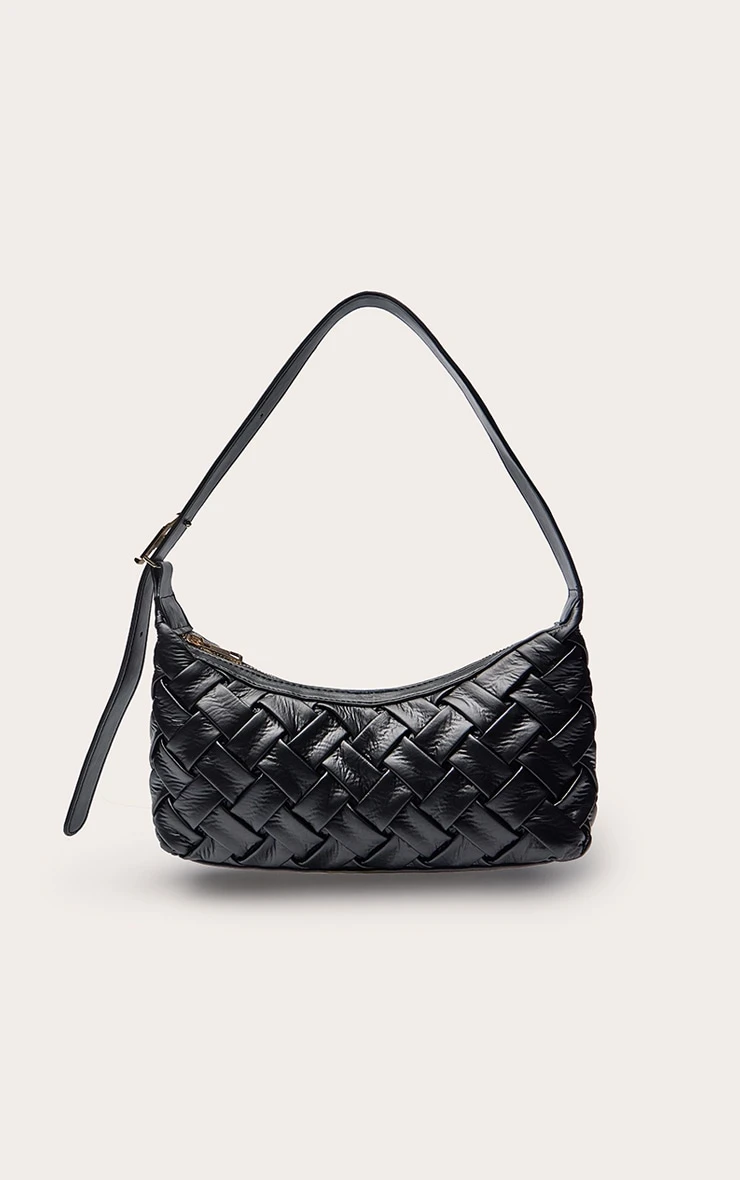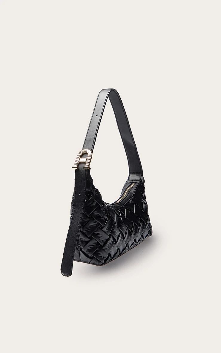 Crafted from premium black faux leather, the intricate hand-woven pattern creates a dynamic, luxury texture. The slim, structured profile is designed to maintain its shape while tucked neatly under the arm, providing a minimalist aesthetic that pairs perfectly with mid-height heels and tailored outfits.