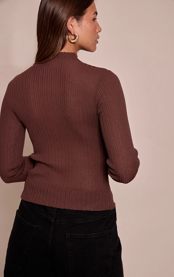 Define your everyday aesthetic with the brown sheer knit high neck top, a core piece designed for seamless styling. Its contemporary high neck and delicate sheer knit balance coverage with an artful peek, while the fine ribbed detailing adds subtle dimension to your look. Pair this versatile brown knit with sharp tailored pants for a polished day ensemble, or dress it down effortlessly with your favorite wide-leg jeans and sneakers for a relaxed, yet considered, finish.