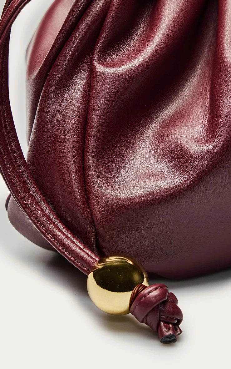 This clutch features a deep, rich burgundy colorway in a unique bead-style ruched material. The pouch silhouette is defined by gathered detailing that creates a voluminous, high-fashion look, while the minimalist closure ensures the texture remains the star of the show. Pair with a maxi dress and kitten heels for a refined finish.