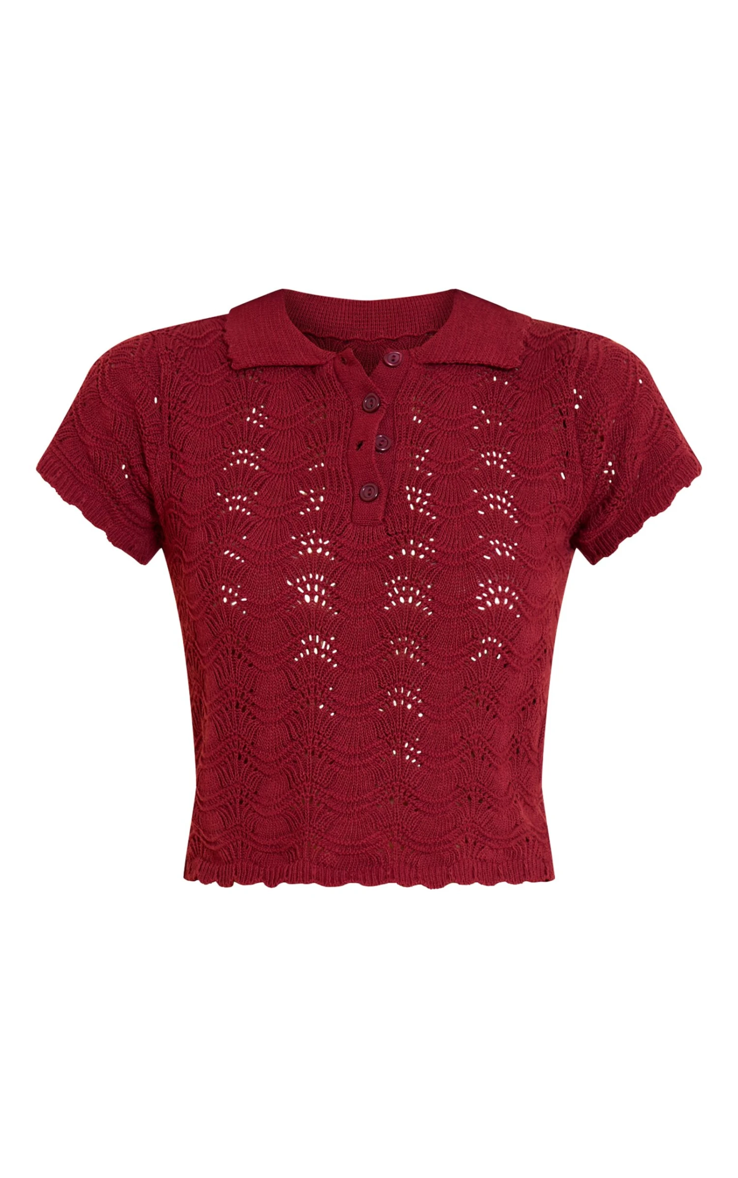 Channel a rich, deep hue into your daywear. The burgundy crochet polo neck top redefines effortless day styling with its distinctive open-knit design and classic collar, subtly accented by a three-value placket. Its cropped cut and short sleeves offer a relaxed yet refined silhouette, perfect for warmer days. Pair with the matching crochet shorts for a coordinated summer look, or team it with high-waisted denim jeans and classic sneakers for a cool, casual vibe that speaks volumes.
