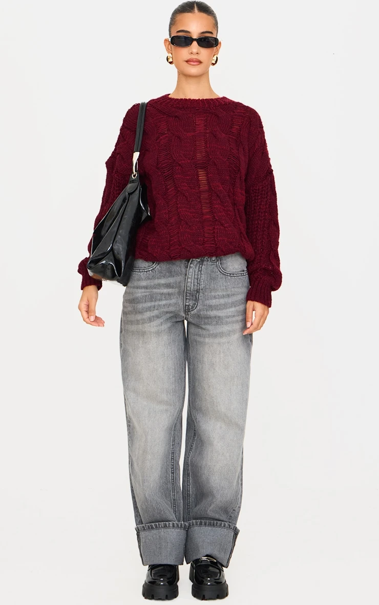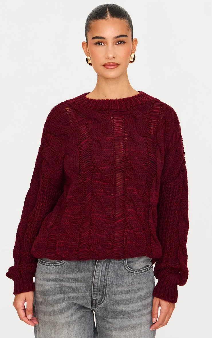 New season knits have arrived, and this burgundy marl knit distressed detail chunky cable sweater is calling your name. Perfectly blending cozy comfort with a high-fashion edge, this piece is designed for those who want to stand out during the colder months.