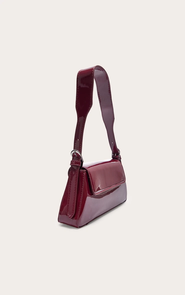 This accessory features a deep burgundy high-shine patent finish that captures the light and adds a touch of luxury to your look. The unique trapeze shape provides a structural edge that is both contemporary and timeless, making it the perfect focal point for evening wear or tailored separates.