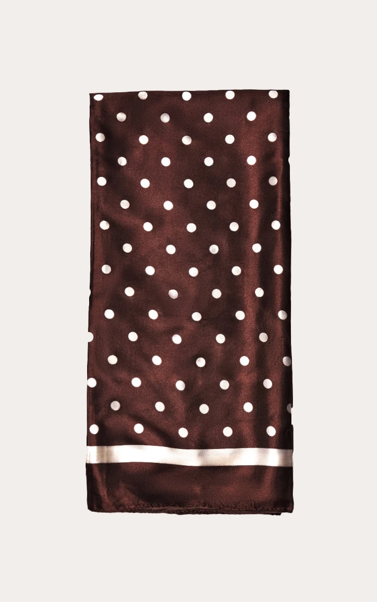 Featuring a rich chocolate brown base accented by crisp cream polka dots, this square silhouette scarf is framed by a bold, contrasting solid border that adds structural definition. Its smooth, satin-like finish catches the light beautifully, making it as versatile as it is stylish.