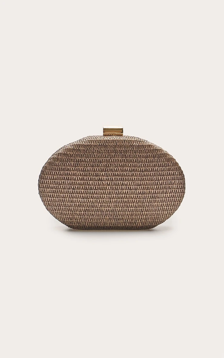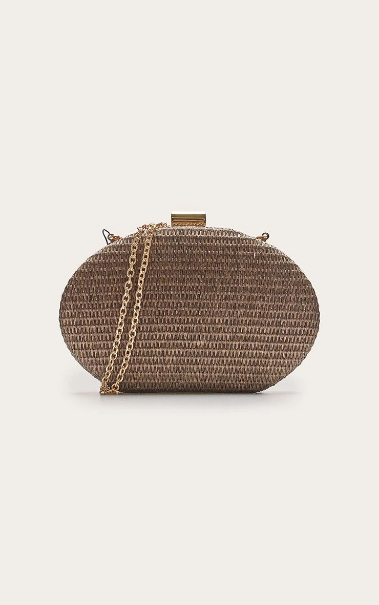 This clutch features a deep, chocolate-toned raffia weave that offers a tactile finish and a rich aesthetic. The structured oval ‘pill’ shape provides a modern, sculpted look, while the polished gold-tone metal clasp adds a touch of luxury. Its compact yet rigid design ensures your essentials are protected while maintaining a sleek profile.