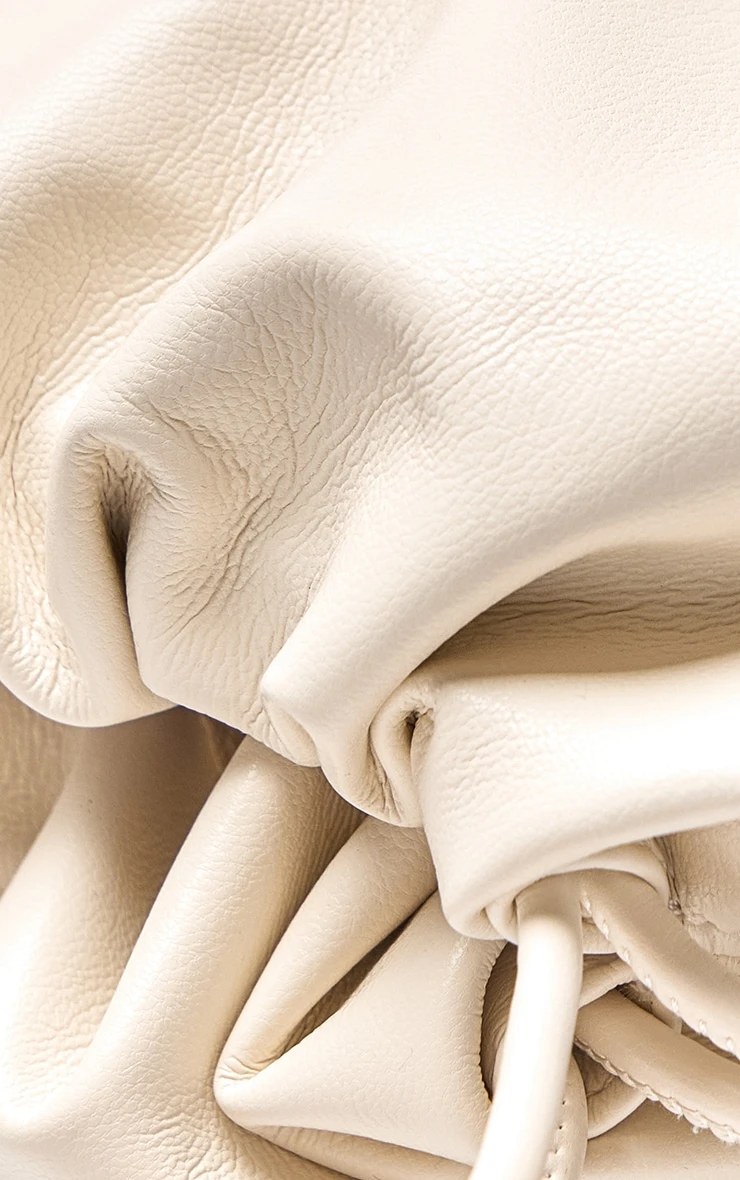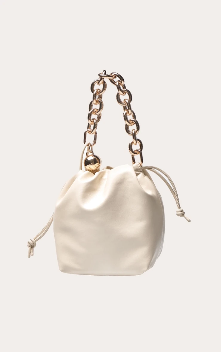 The PrettyLittleThing Cream Chain Bead Pouch Grab Bag is the ultimate blend of playful texture and elegant design. Featuring a softly ruched cream patent PU body, this bag is elevated by delicate bead embellishments and a sleek metallic chain handle, offering a luxurious finish to any ensemble.