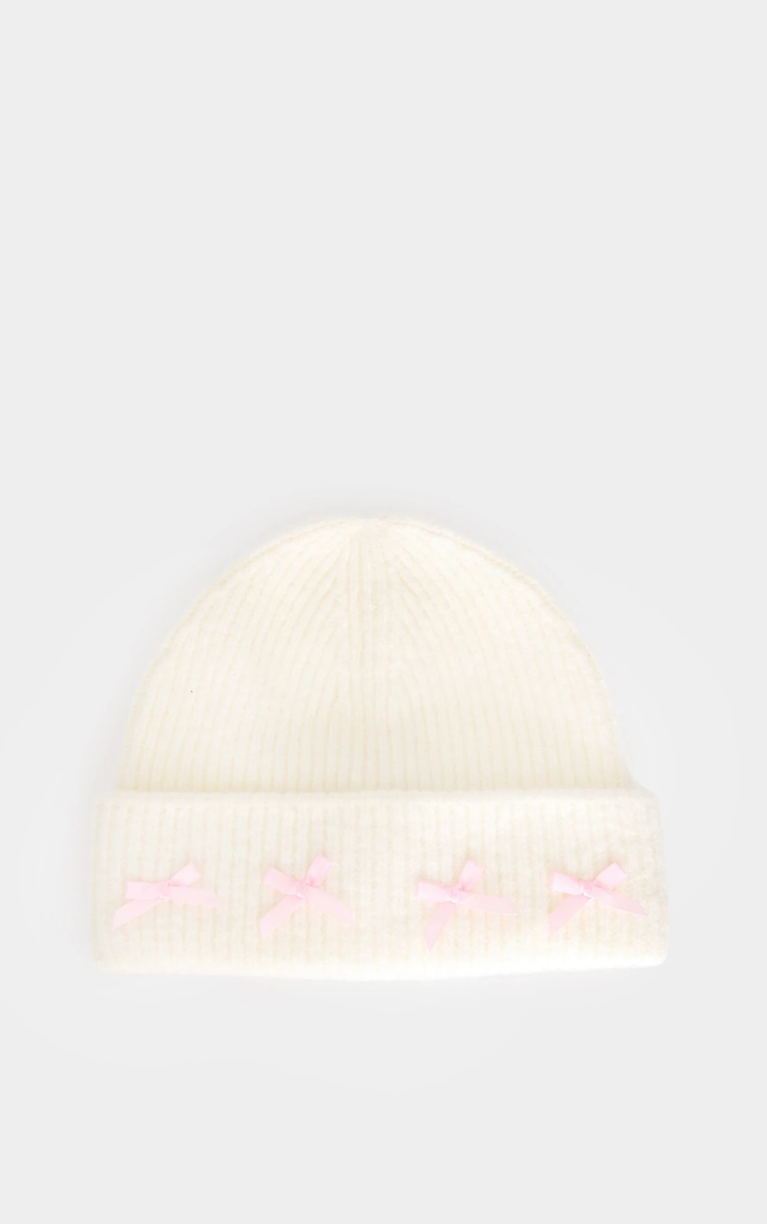 Invest in elevated off-duty styling with this cream ribbed beanie. Crafted from a tactile ribbed knit, this beanie features a subtle bow detail adding a refined touch. The neutral cream hue offers effortless versatility, making it an ideal accessory for cooler days. Style it with a tonal overcoat and leather pants for a considered weekend edit.