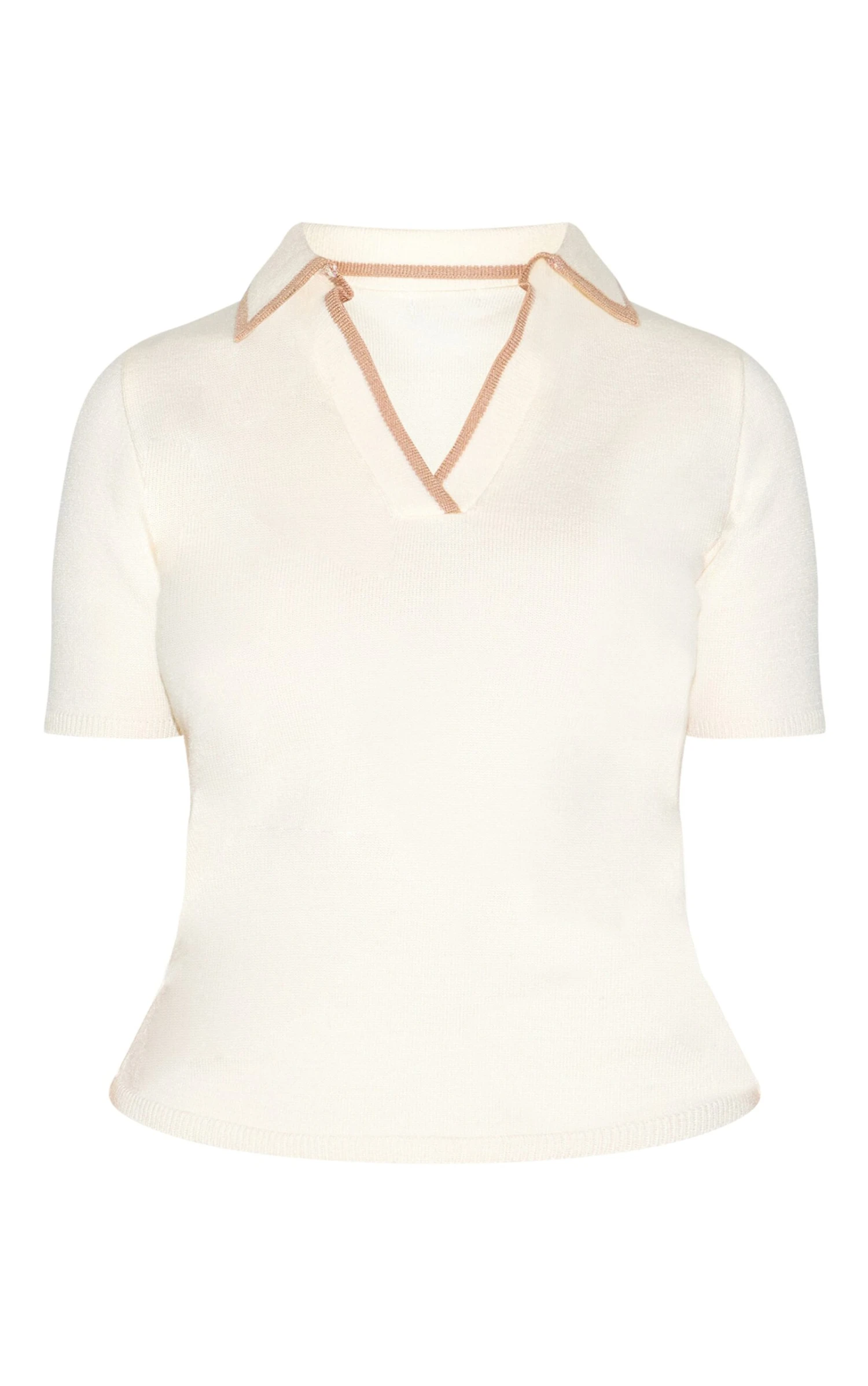 Brought to you in a cream knitted material with a contrast polo collar design. Team this cream knitted contrast polo collar top with a pair of wide leg pants and your favorite loafers for a chic off-duty look we are loving.
