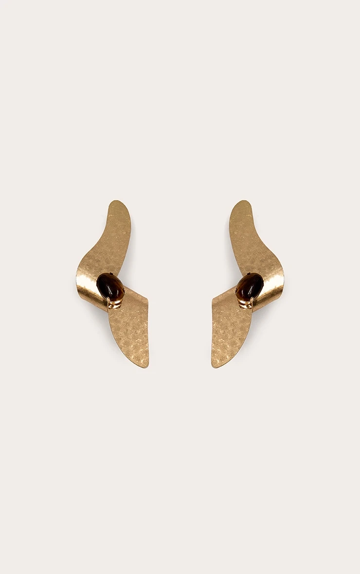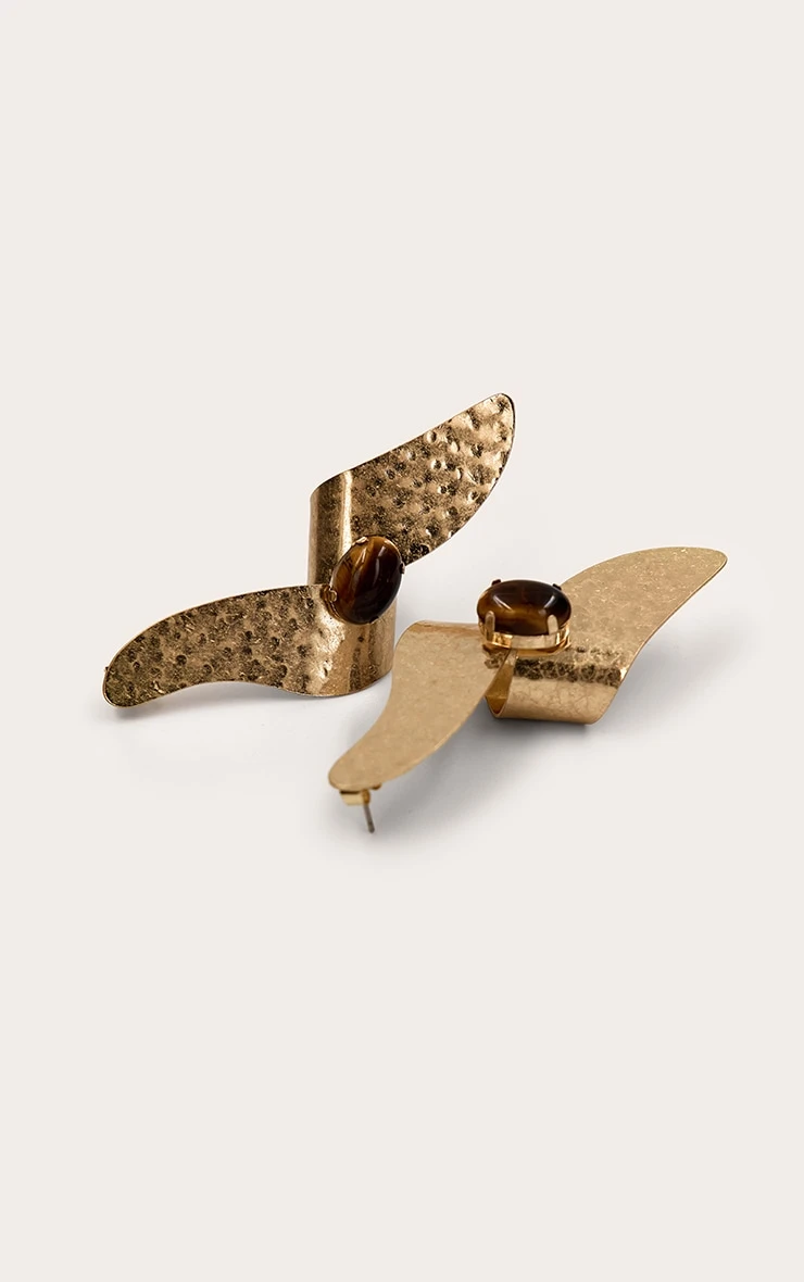 Enhance your outfit in these gold hammered abstract tigers eye statement earrings. Brought to you with a stud fastening closure, these earrings are made from hammered gold material with an abstract shape and tigers eye detailing. Team them with gold bangles for a chic look.