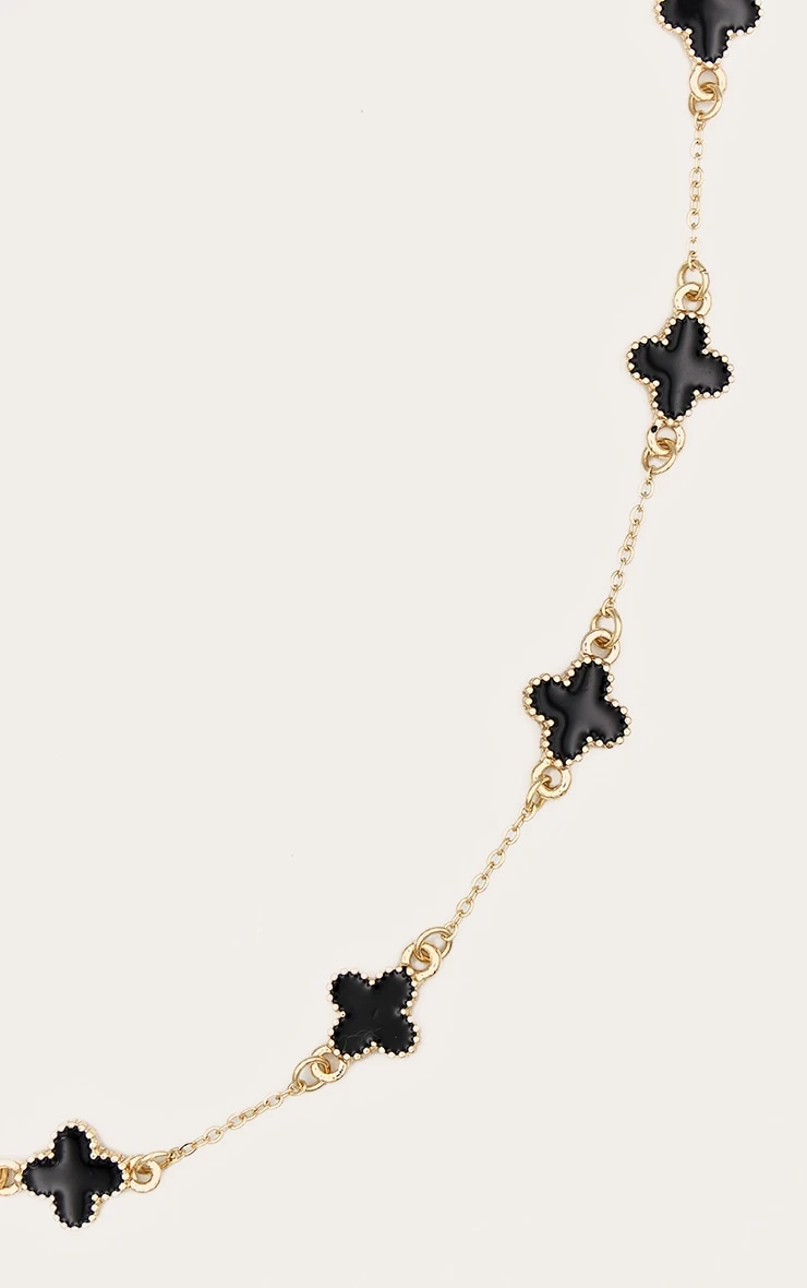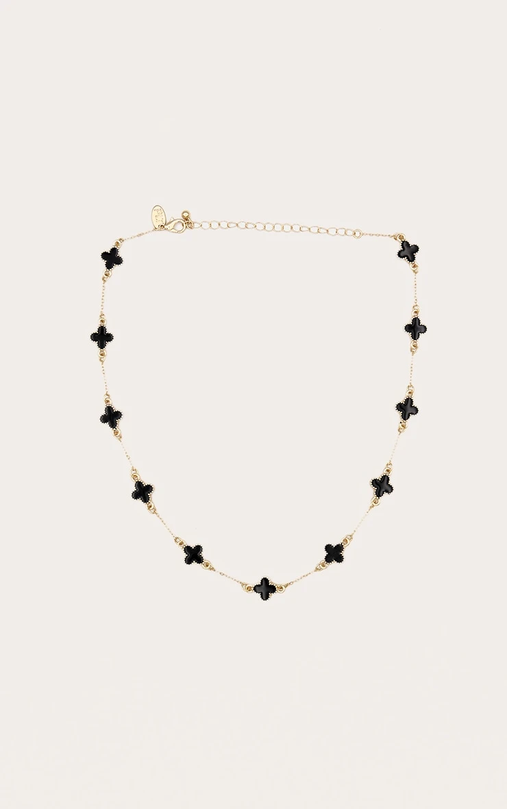 Crafted in a radiant gold-tone finish, this necklace features a striking quatrefoil clover pendant with a sleek black inlay. The contrast between the metallic gold and the dark center creates a bold yet minimalist aesthetic that effortlessly transitions from office tailoring to evening glamour.