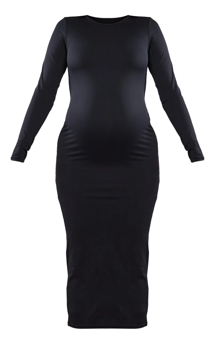 Navigate pregnancy with unwavering style in this black long-sleeve midaxi dress, a masterclass in minimalist sophistication. Crafted from a sculpting material that gently contours the body, this dress offers both support and a streamlined silhouette. The long sleeves provide elegant coverage, while the midaxi length lends itself to versatile styling. Effortlessly transition from daytime appointments to evening engagements; simply add a delicate gold chain from our jewelry collection to elevate the look.