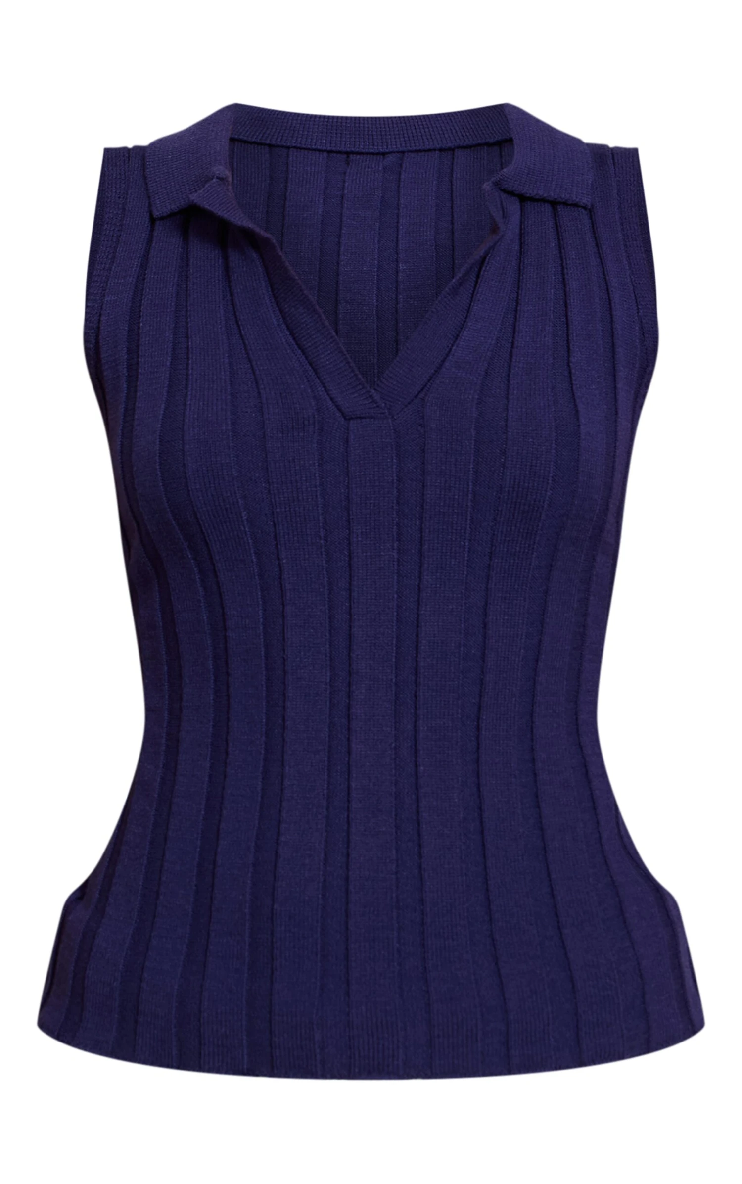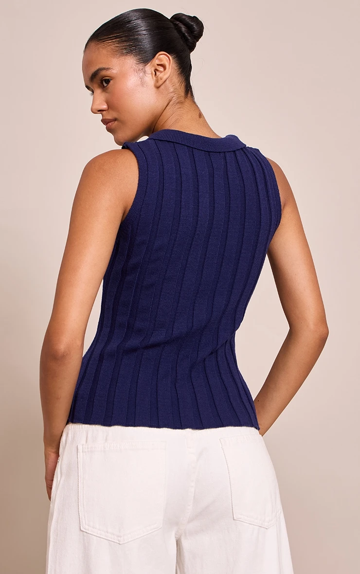 Update your staples with the navy sleeveless wide rib polo top. Made from a navy wide rib knit fabric with a sleeveless cut and classic polo collar, it’s a versatile layering piece. Wear with tailored pants, kitten heels or denim for a smart-casual finish.