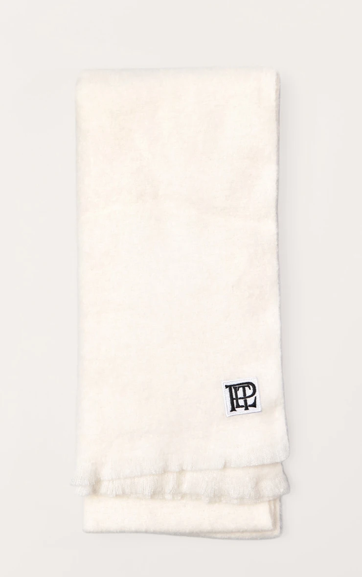 Wrap up in the plt badge cream brushed knit scarf. Made from a cream brushed knit material, it features a plt badge detail, soft finish, and tassel ends. Style with your winter coat and a chunky boots for timeless appeal.
