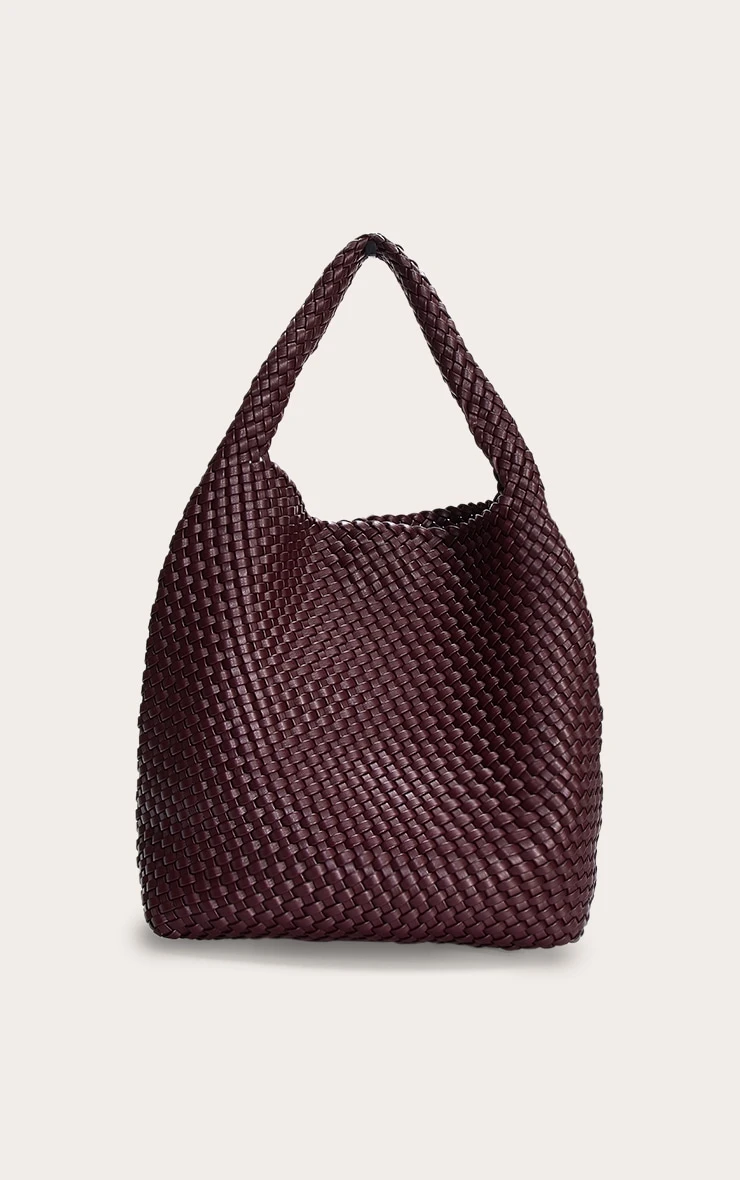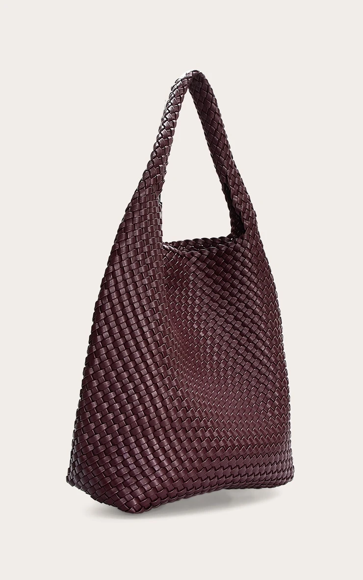Crafted from premium burgundy faux leather, this bag features a striking textured woven finish that provides a luxurious tactile feel and a high-end look. Its compact silhouette and integrated shoulder strap make it an effortless choice for transitioning from morning errands to evening drinks.