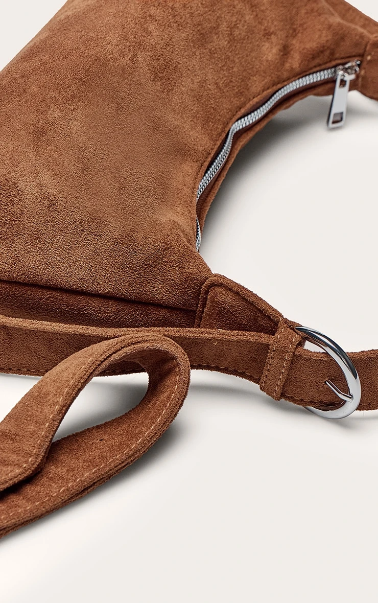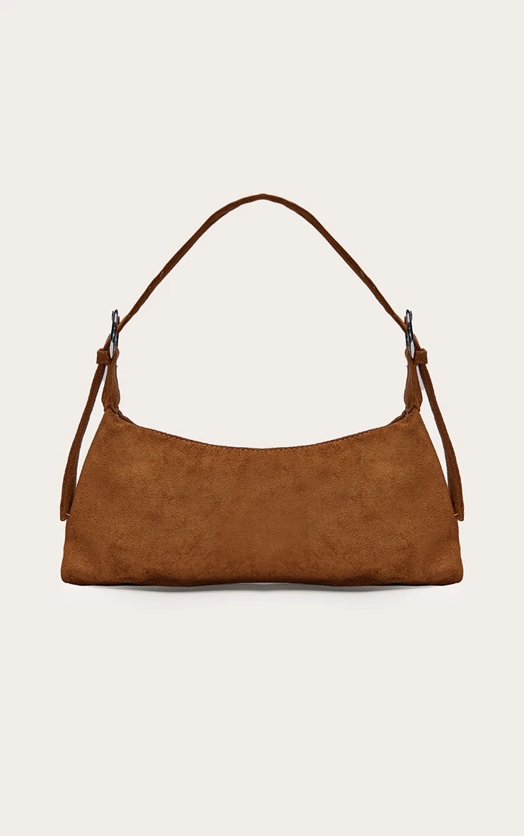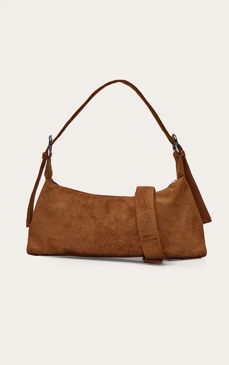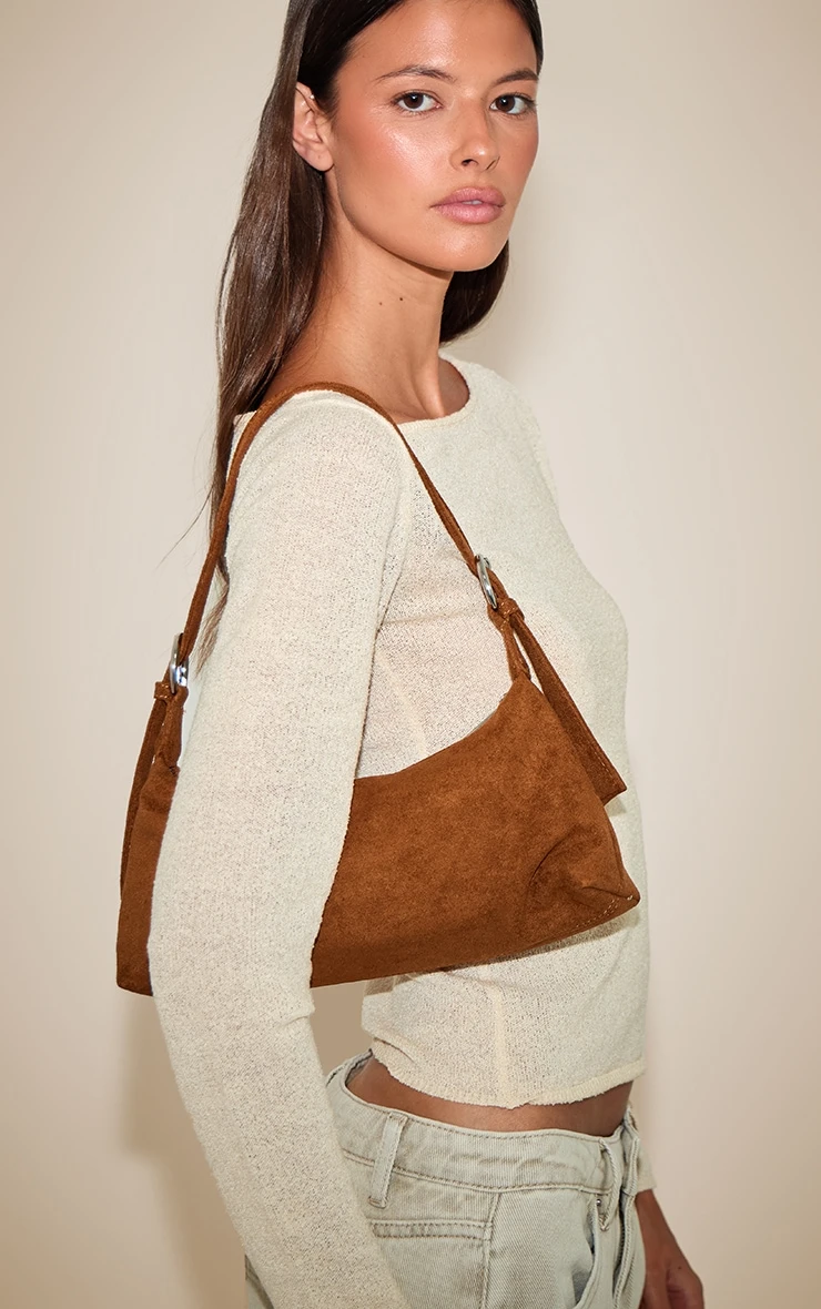 Effortless Sophistication. Opt for a classic silhouette with this tan suede adjustable shoulder bag from PrettyLittleThing. This essential accessory provides a tactile finish to any ensemble, making it a versatile staple for your collection.