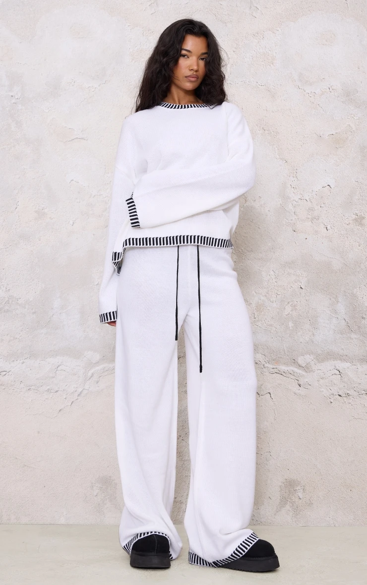 Consider these cream knit pants your new off-duty essential. The neutral shade offers endless styling potential, whilst the contrast stitch detail elevates the design from simple to subtly statement. Crafted from a comfortable knit, they feature a practical drawstring waist for a personalised fit. Style yours with a crisp white shirt for a refined daytime edit, or pair them with tailored pants from our bottoms collection for a sleek, contemporary silhouette.