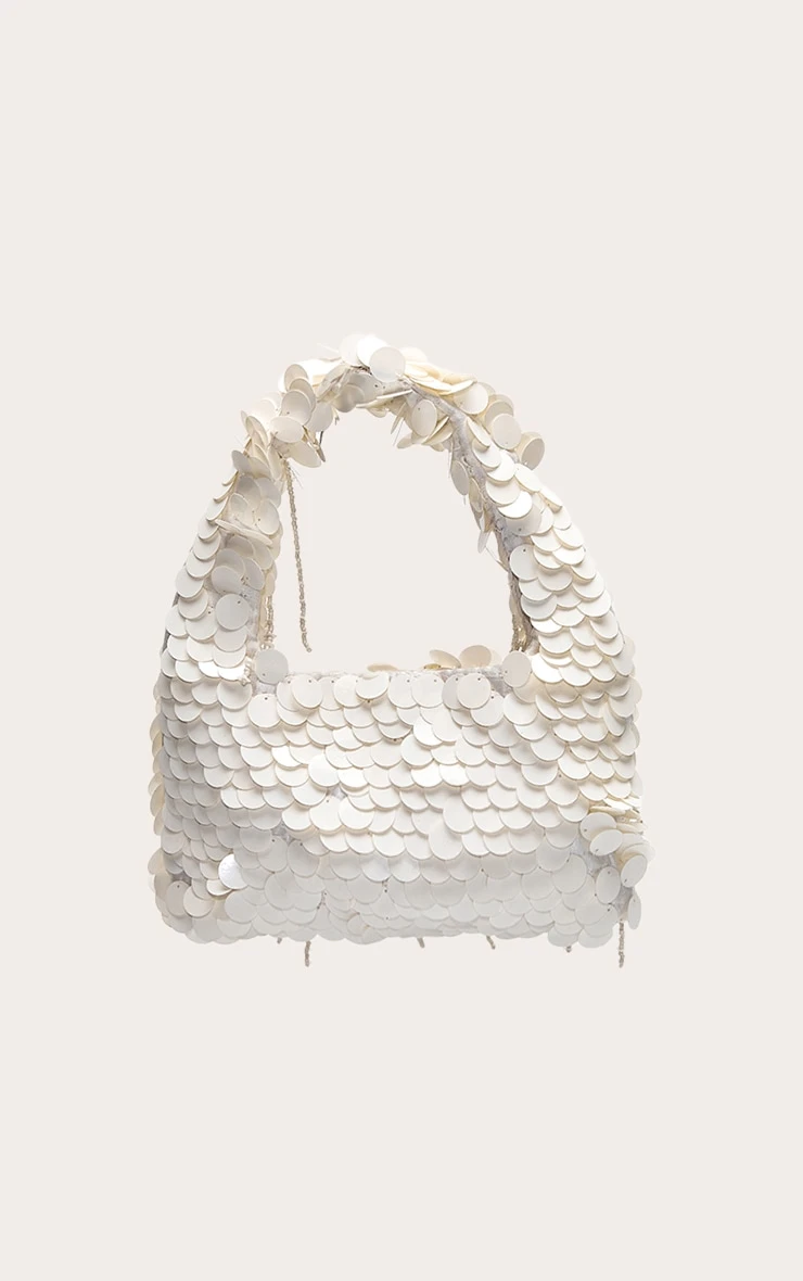 Take your look to the next level with the PrettyLittleThing white sequin shaggy mini bag. A true statement piece, this bag is designed to catch the light and add an instant touch of glamour to your evening ensemble.