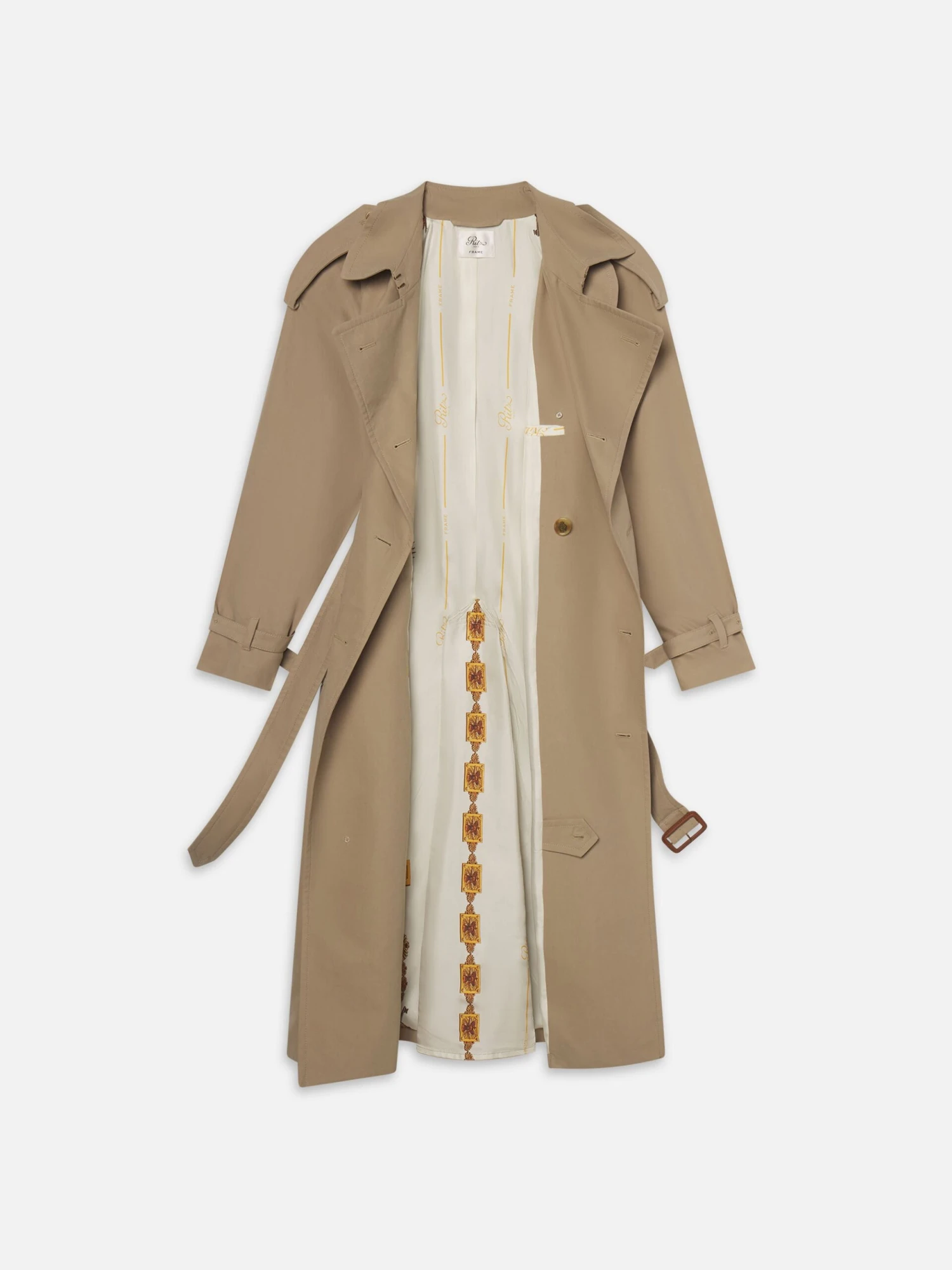 A French staple for generations, the double-breasted trench fuses timeless style with function. Traditional epaulets, a storm flap, and a coordinating, waist-cinching belt are accompanied by luxe details familiar to the line—soft, silk lining with the Ritz logo and moniker summarys.