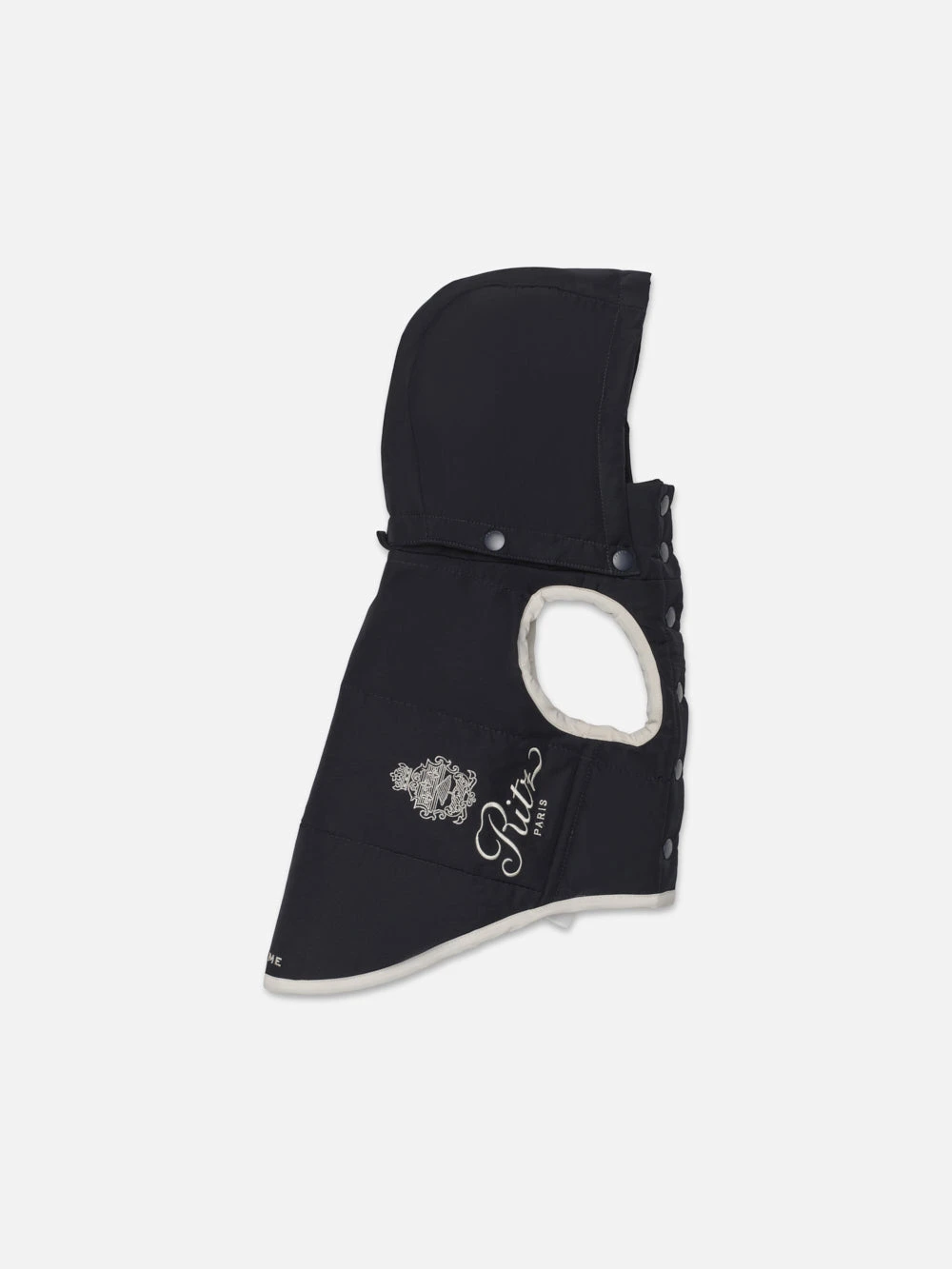 The deep navy body is perfectly accented by high-contrast white trim, featuring the prestigious Ritz Paris logo embroidered on each side for a distinguished look on or off duty. This piece seamlessly blends high-fashion aesthetics with functional pet wear.