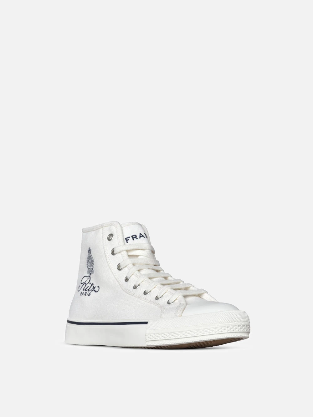 Presented in unisex sizing for les femmes and les hommes, this classic high top sneaker looks as cool styled with a minidress as it does cuffed denim. Crafted from 100% cotton in Blanc, set on a rubber sole and finished with the Ritz Paris logo in Navy. Run, don’t walk.