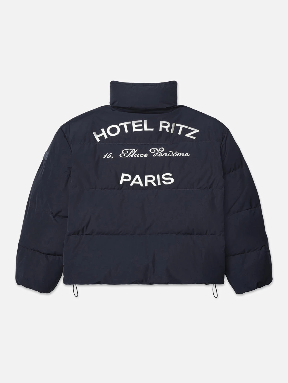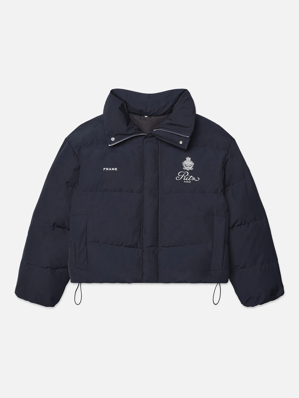 Cropped for a fit that works with wide-legs and winter sportswear, zip up the neck on this abundantly warm Navy puffer to keep out harsh city winds—then wear it open for aprés hour. Crafted from cotton and recycled polyester and finished with functional drawstring cords and the FRAME and Ritz Paris logos in contrasting white.